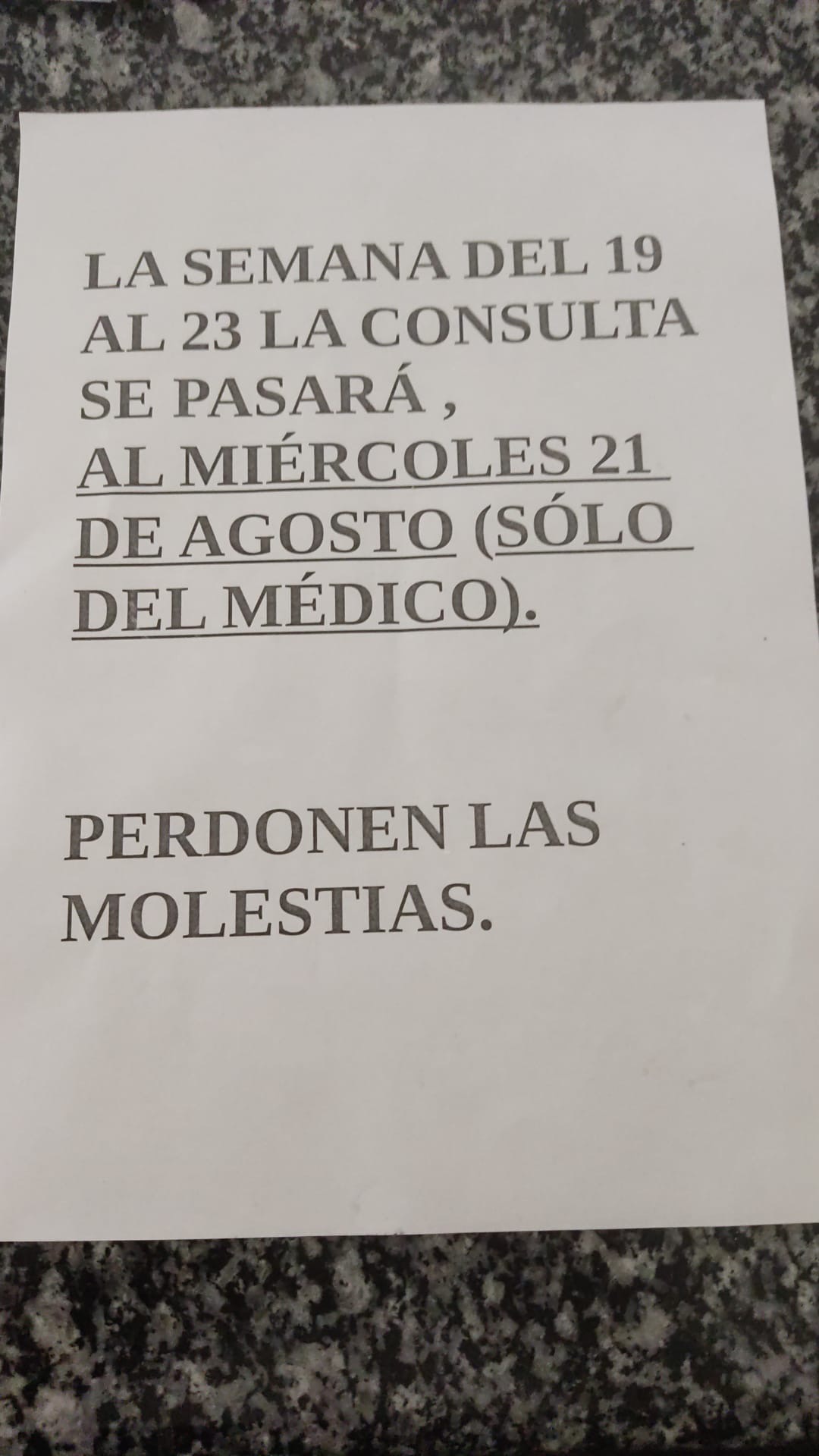 La próxima semana la consulta médica se cambia al miércoles 21 de agosto (ver cartel adjunto).