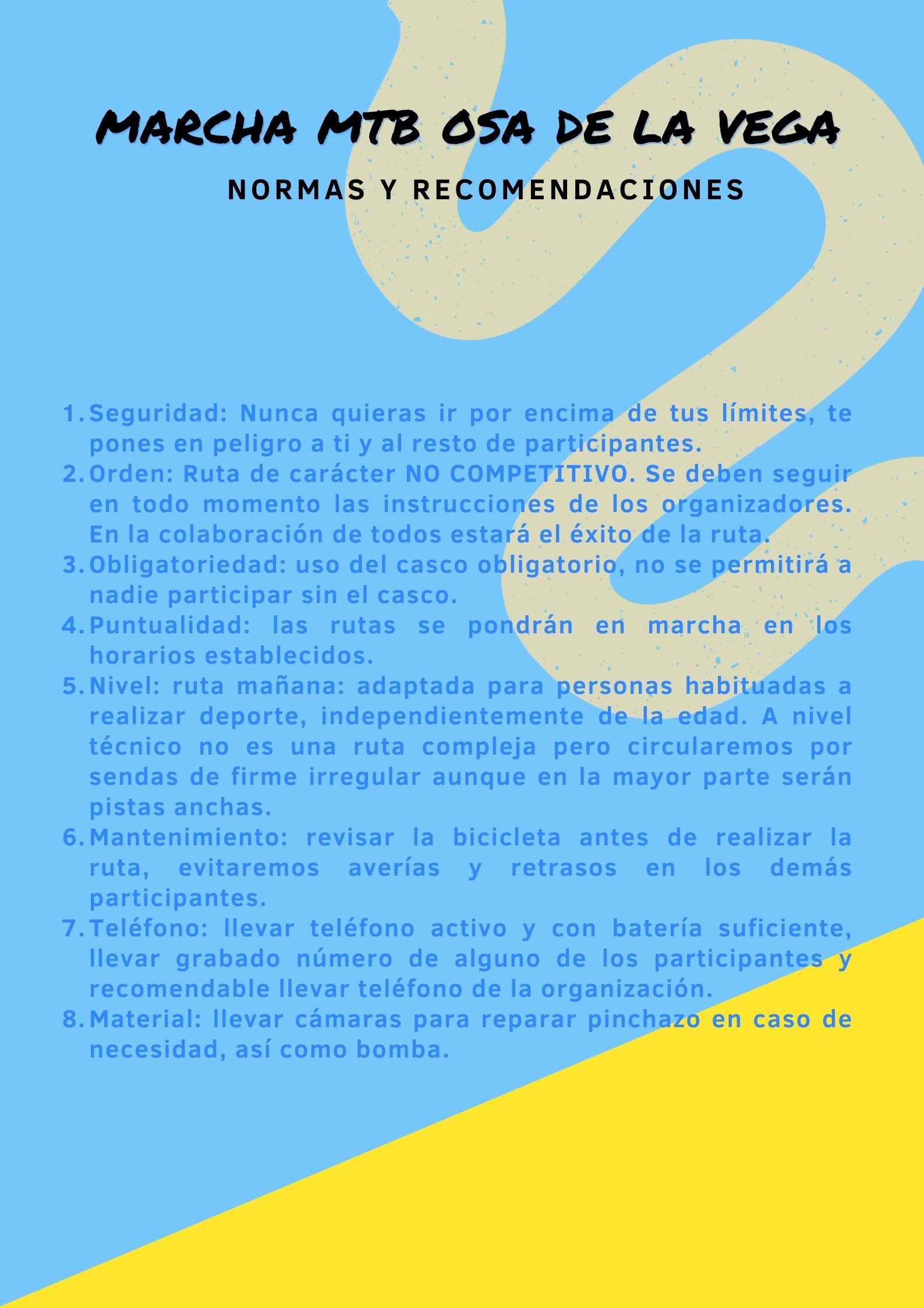 - Orden: Ruta de carácter NO COMPETITIVO. Se deben seguir en todo momento las instrucciones de los organizadores. En la colaboración de todos estará el éxito de la ruta.