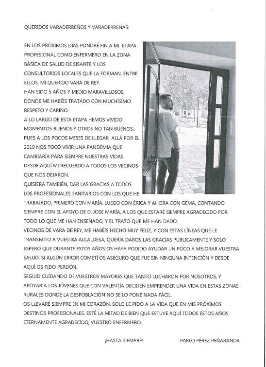 Hace unas semanas Pablo, el enfermero, pasó por el Ayuntamiento para despedirse y nos dejó esta carta dedicada a los vecinos de Vara de Rey.