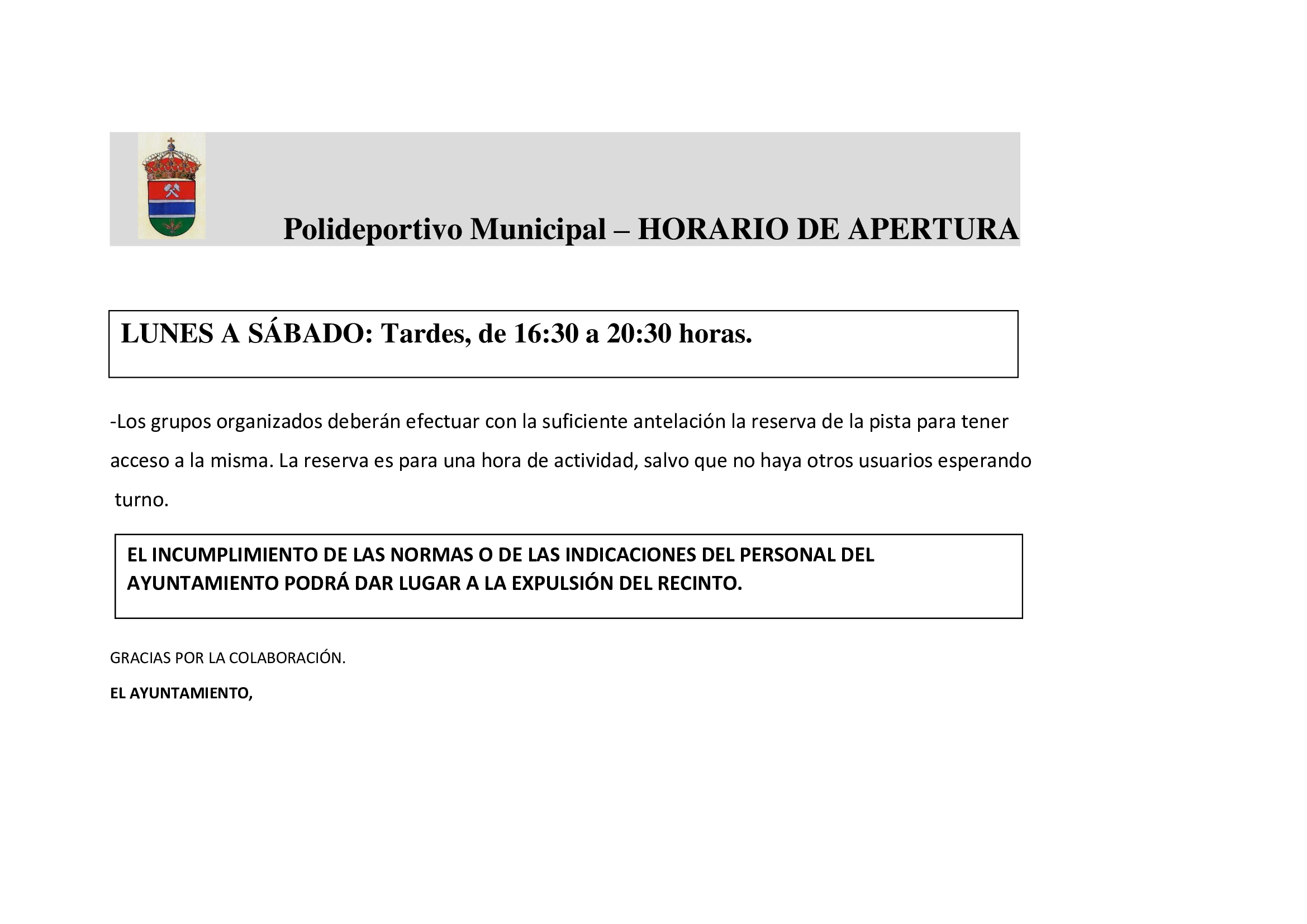 Se informa que a partir del martes 1 de octubre, se abrirá el polideportivo municipal con el siguiente horario (imagen adjunta):- De lunes a sábado, de 16:30 a 20:30 horas.