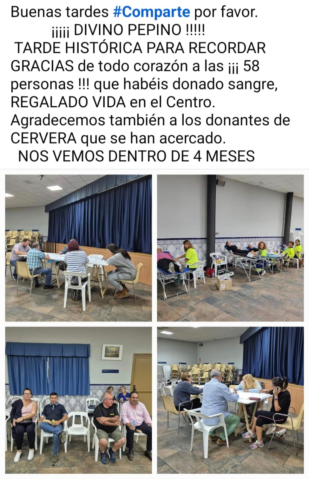 Desde la Hermandad de Donantes de Sangre de Talavera, nos transmiten el agradecimiento a las 58 personas que han donado sangre, REGALANDO VIDA, en el Centro Social Polivalente de Pepino.