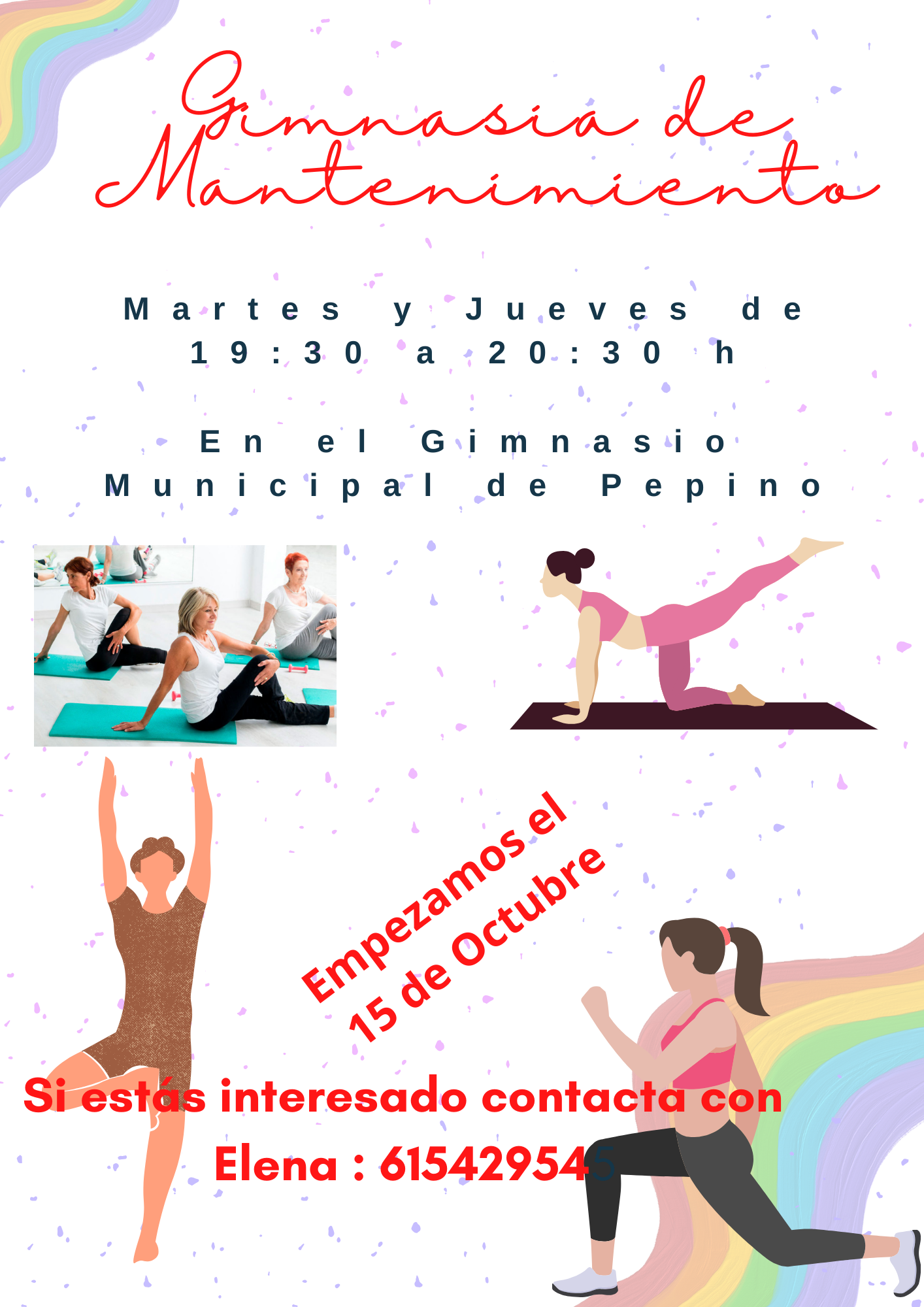 GIMNASIA DE MANTENIMIENTO, en el Gimnasio Municipal de Pepino.HORARIO: Martes y Jueves de 19:30 h a 20:30 hFECHA: Empezamos el 15 de octubreSi estás interesado/a contacta con Elena: TLF 615-429-545