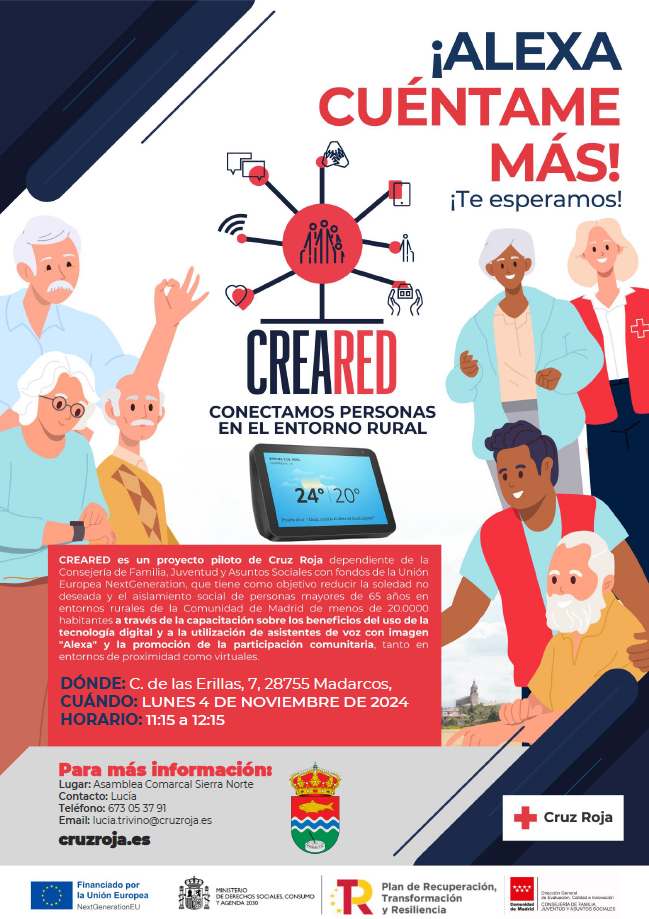 El próximo lunes 4 de noviembre de 11:15 a 12:15 tendrá lugar el taller ¡Alexa, cuéntame más! del proyecto CREARED de Cruz Roja. Será en la Calle Erillas, 7. Este taller está dirigido a personas mayores de 65 años.