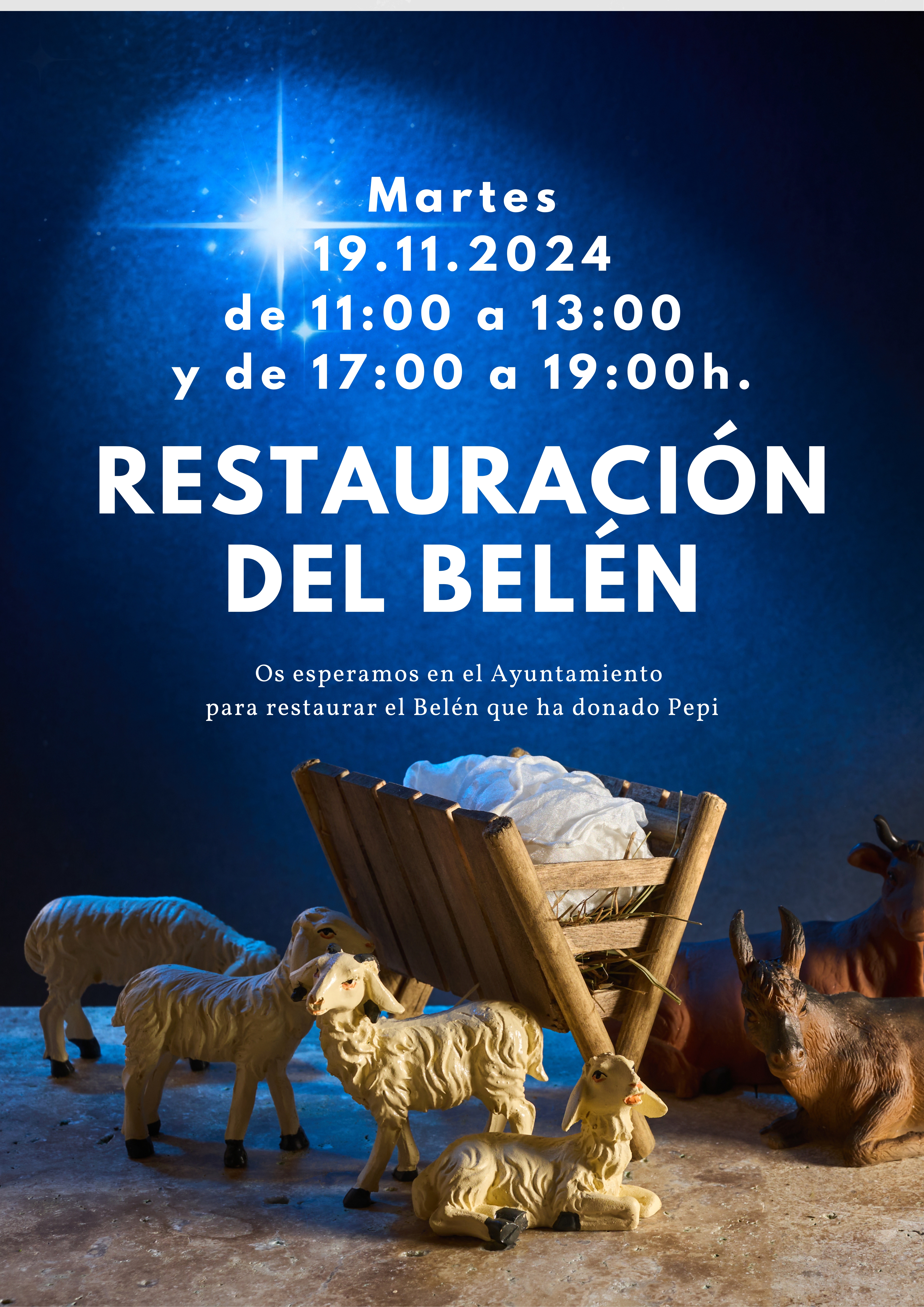 El próximo martes 19 de noviembre vamos a reparar el Belén que ha donado Pepi y nos encantaría poder contar con tu ayuda para dejarlo todo en perfecto estado. Te esperamos en el Ayuntamiento de 11:00 a 13:00 y de 17:00 a 19:00 h.