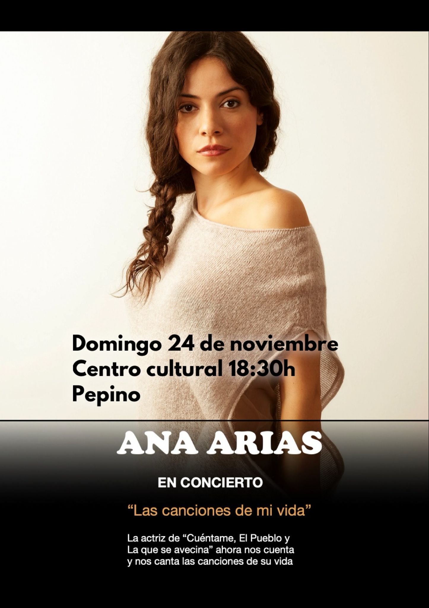 Se recuerda que el DOMINGO 24 DE NOVIEMBRE DE 2024, tendrá lugar el CONCIERTO DE ANA ARIAS: "LAS CANCIONES DE MI VIDA", en el CENTRO SOCIAL POLIVALENTE DE PEPINO, a las 18:30 H.