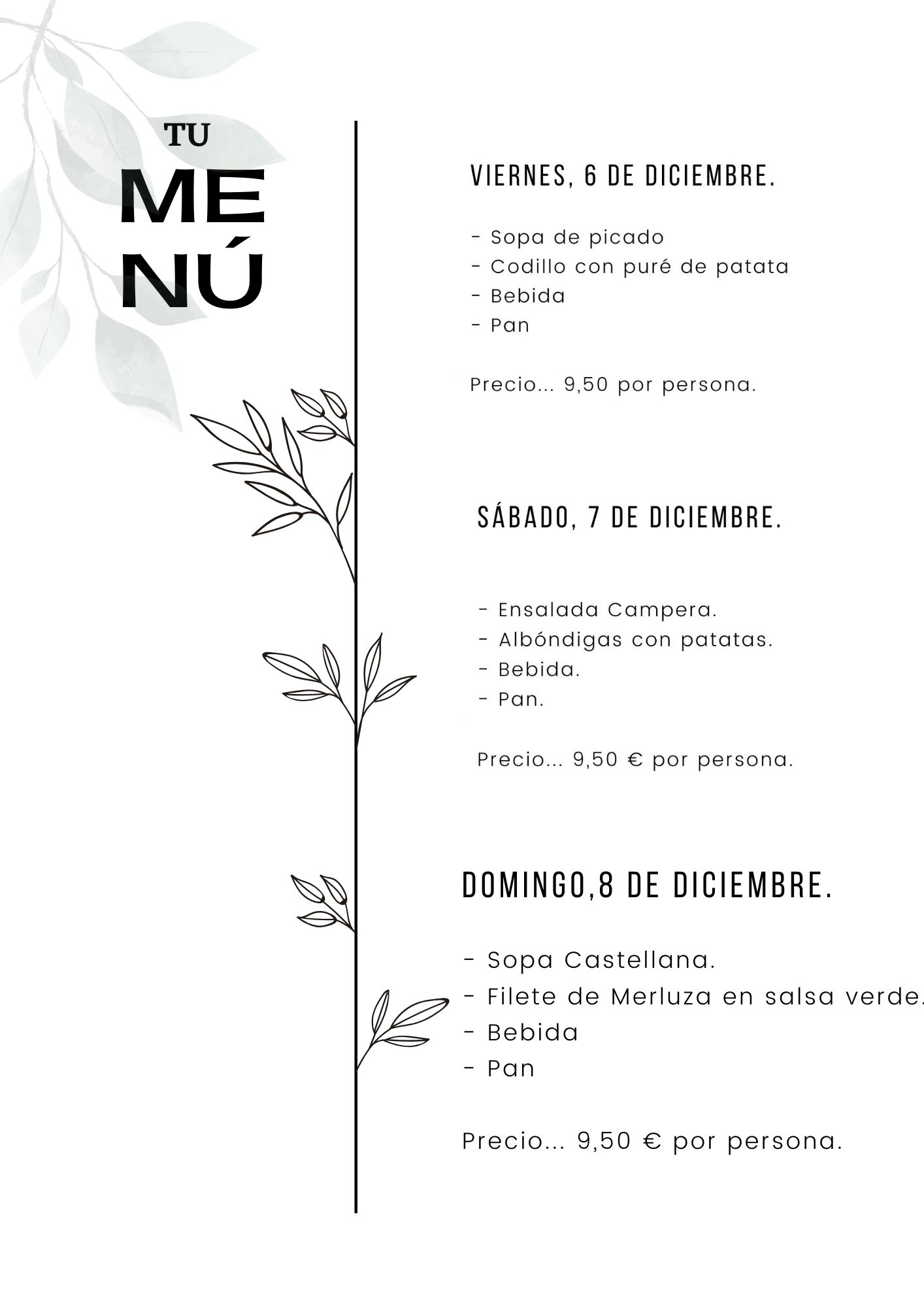El menú contará de un primer plato, segundo plato y bebida (botes), que