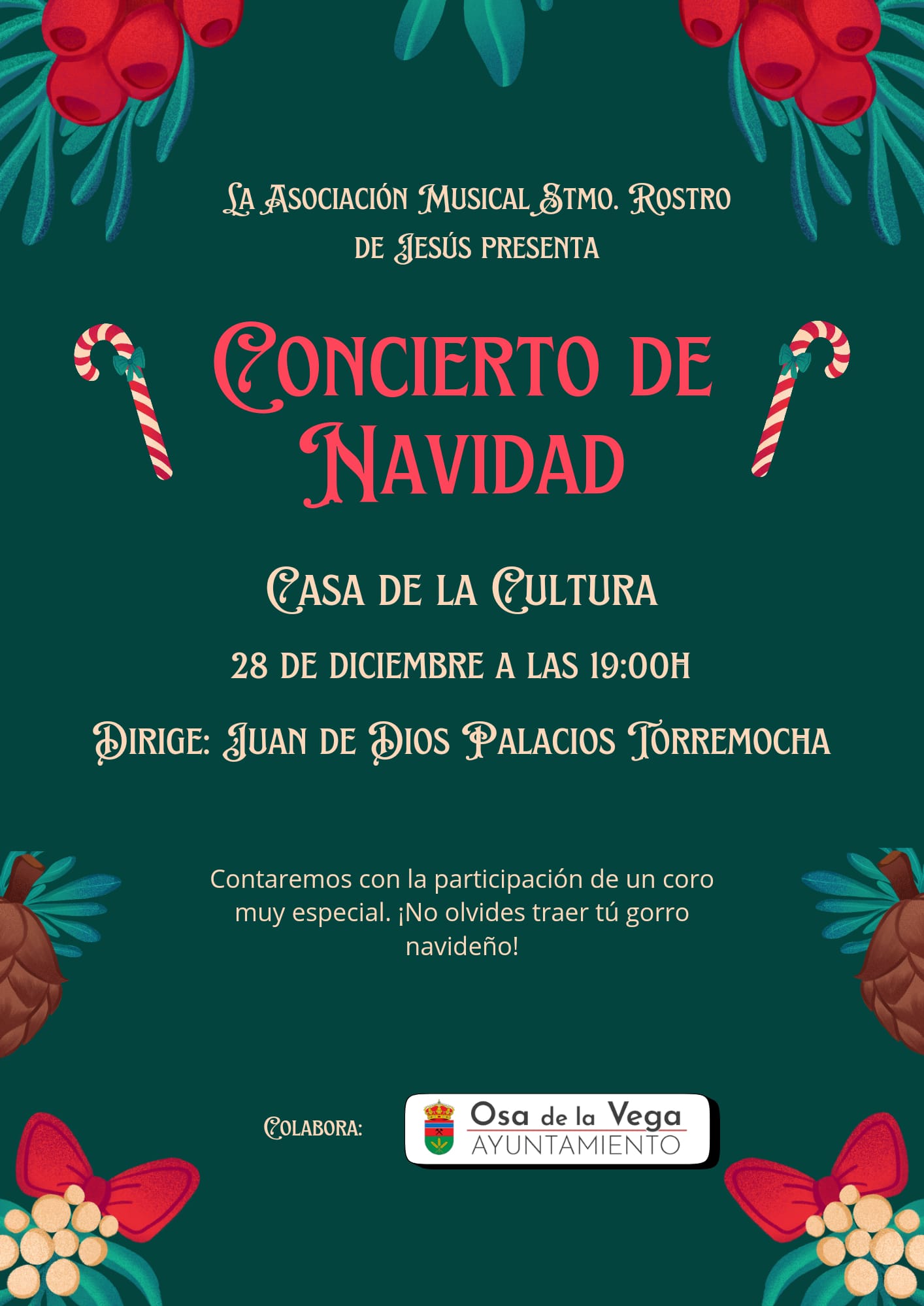 La Asociación Musical Stmo. Rostro de Jesús presenta el Concierto de Navidad 🎄. Dirigido por Juan De Dios Palacios Torremocha, contará con la participación de un coro muy especial. ¡No olvides traer tu gorro navideño! 🧑🎄