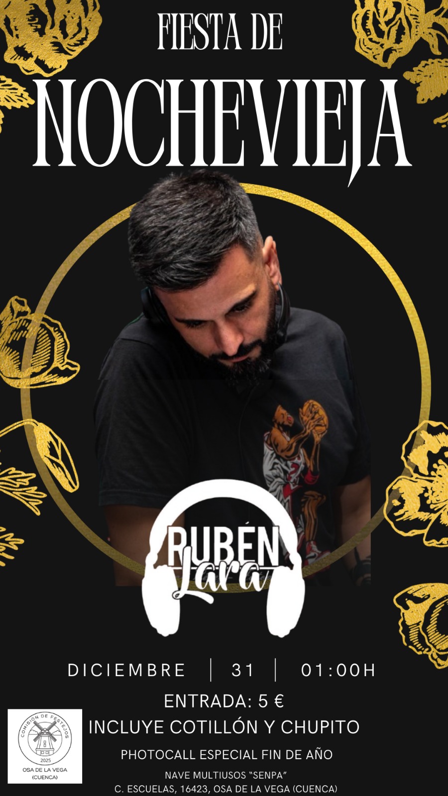31 de diciembre - 01:00 horas, con Rubén Lara DJ 🎧Entrada 5 €, incluye cotillón y chupito 🎉 🥃Photocall especial fin de año 📸En la Nave Multiusos "Senpa"Organiza: Comisión de Festejos Osa de la Vega 2025