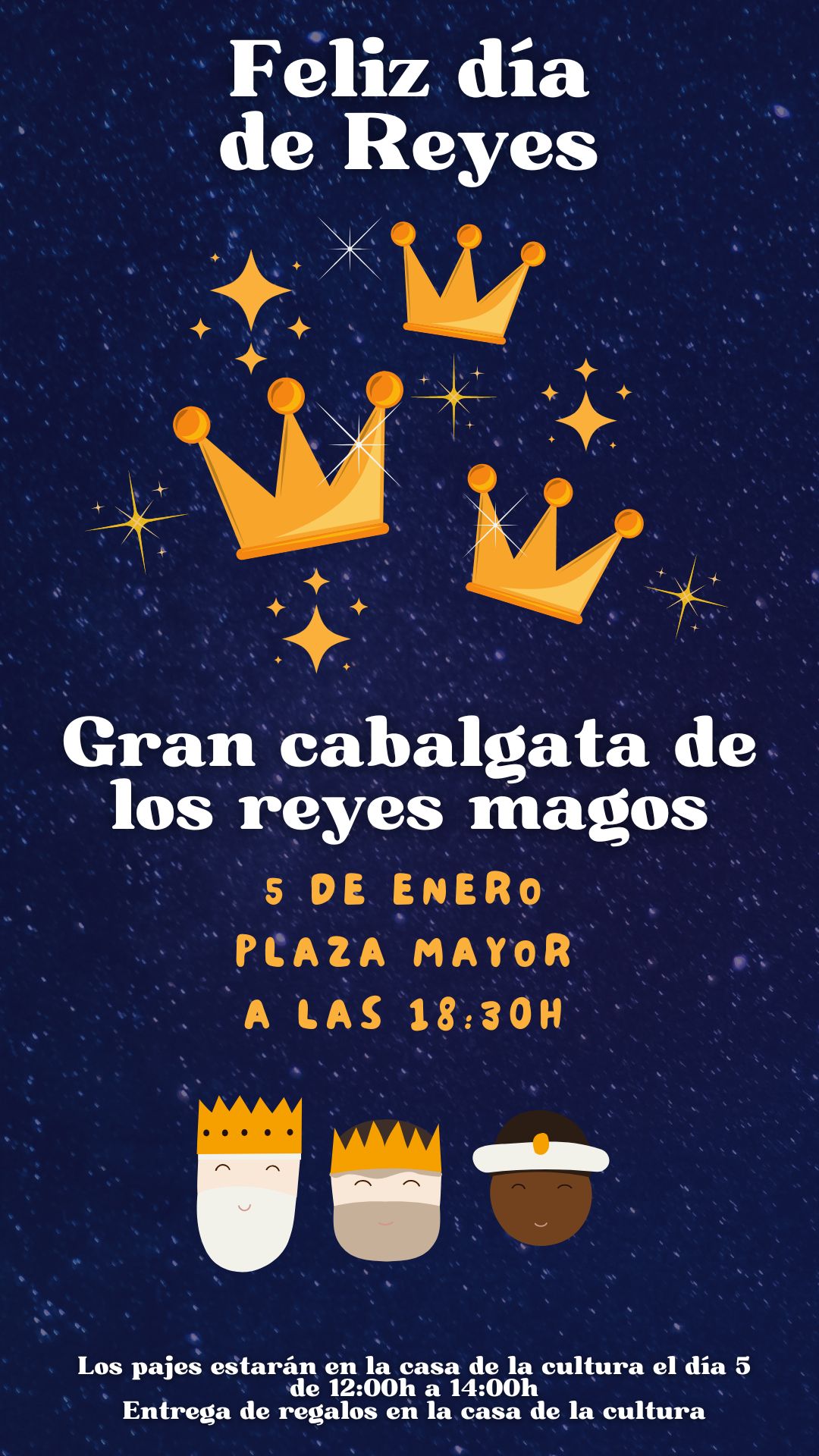 Gran cabalgata de los Reyes Magos π π« π π« π π« El domingo 5 de enero a las 18:30 horas, en la Plaza Mayor (Los pajes estarΓ‘n en la Casa de la Cultura el dΓa 5 de 12:00 a 14:00 horas). Entrega de regalos π en la Casa de la Cultura