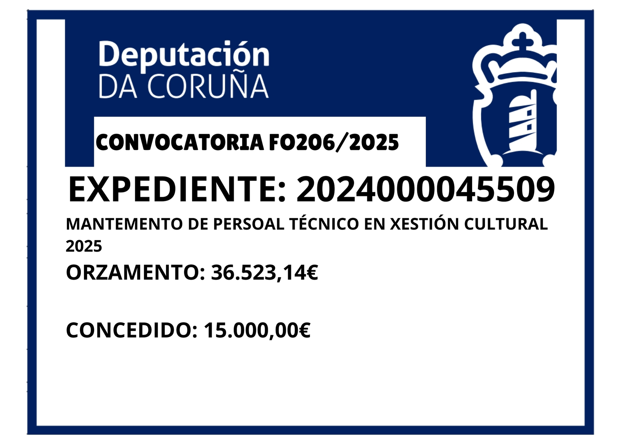 O CONCELLO DE LOUSAME RESULTOU BENEFICIARIO DUNHA SUBVENCIÓN DA DEPUTACIÓN DA CORUÑA AO ABEIRO DO PROGRAMA DE SUBVENCIÓNS A CONCELLOS E OUTRAS ENTIDADES LOCAIS PARA FINANCIAR GASTOS DE PERSOAL TÉCNICO NOS SERVIZOS MUNICIPAIS DE CULTURA EN 2025 (FO206/2025), POR IMPORTE DE 15.000,00 €