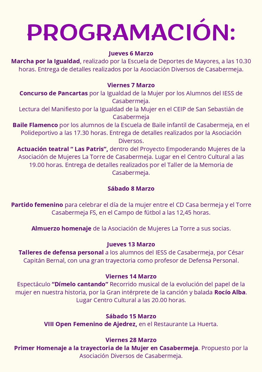 💜 Por ello, desde el Ayuntamiento de Casabermeja, os invitamos a participar en las actividades organizadas en torno a esta jornada, promoviendo la reflexión, el reconocimiento y la acción por la igualdad.