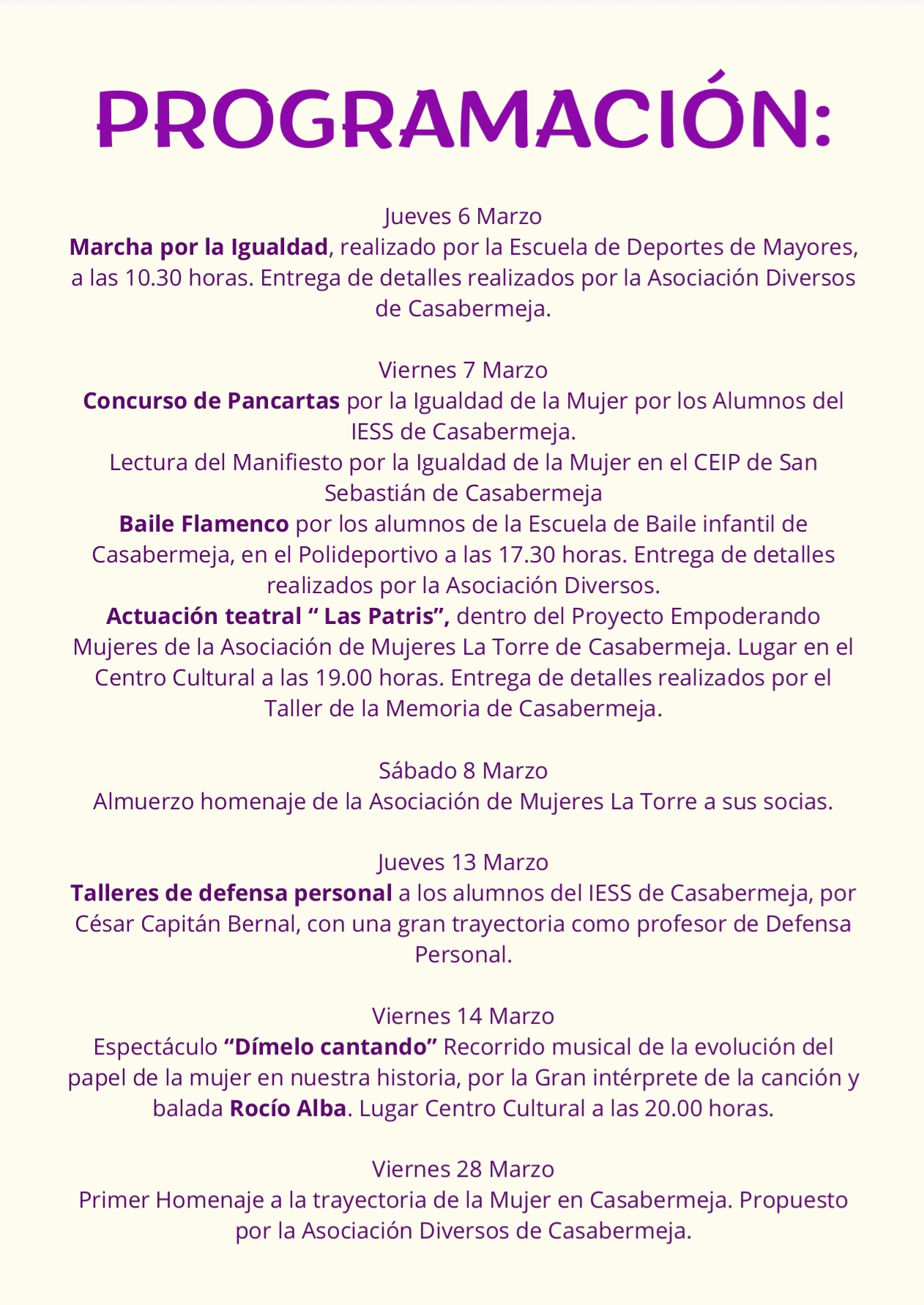 💜 Por ello, desde el Ayuntamiento de Casabermeja, os invitamos a participar en las actividades organizadas en torno a esta jornada, promoviendo la reflexión, el reconocimiento y la acción por la igualdad.