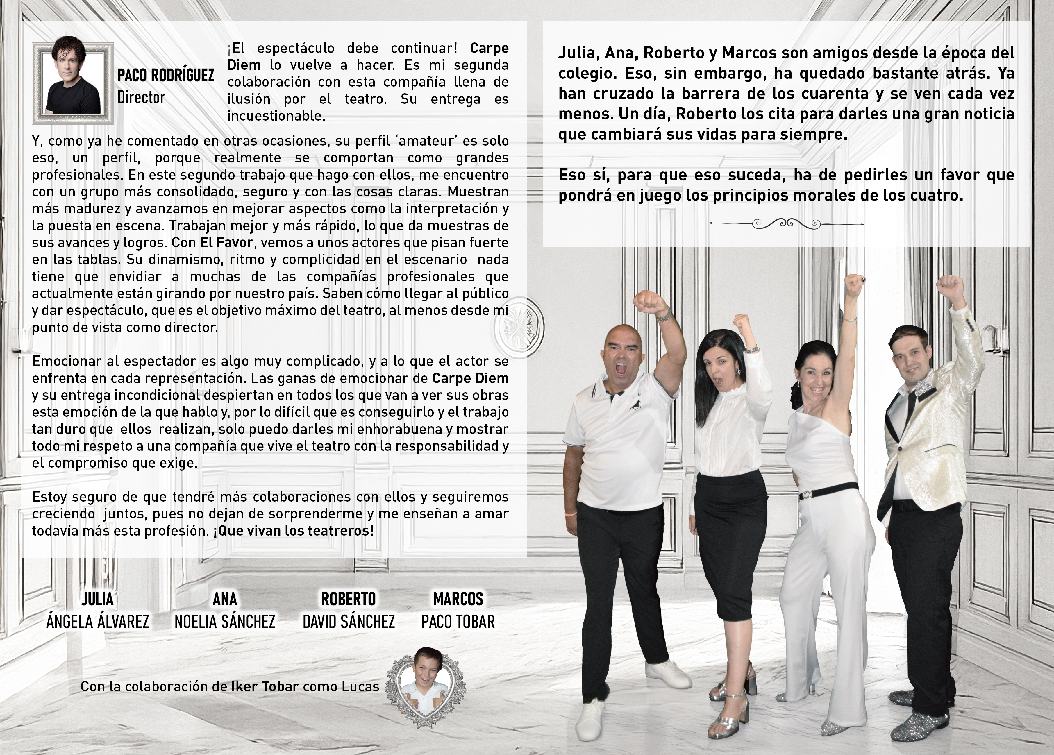 Os recordamos que hoy sábado 26 de abril podemos disfrutar de la representación teatral "EL FAVOR" interpretada por la compañía torrijeña Carpe Diem.
