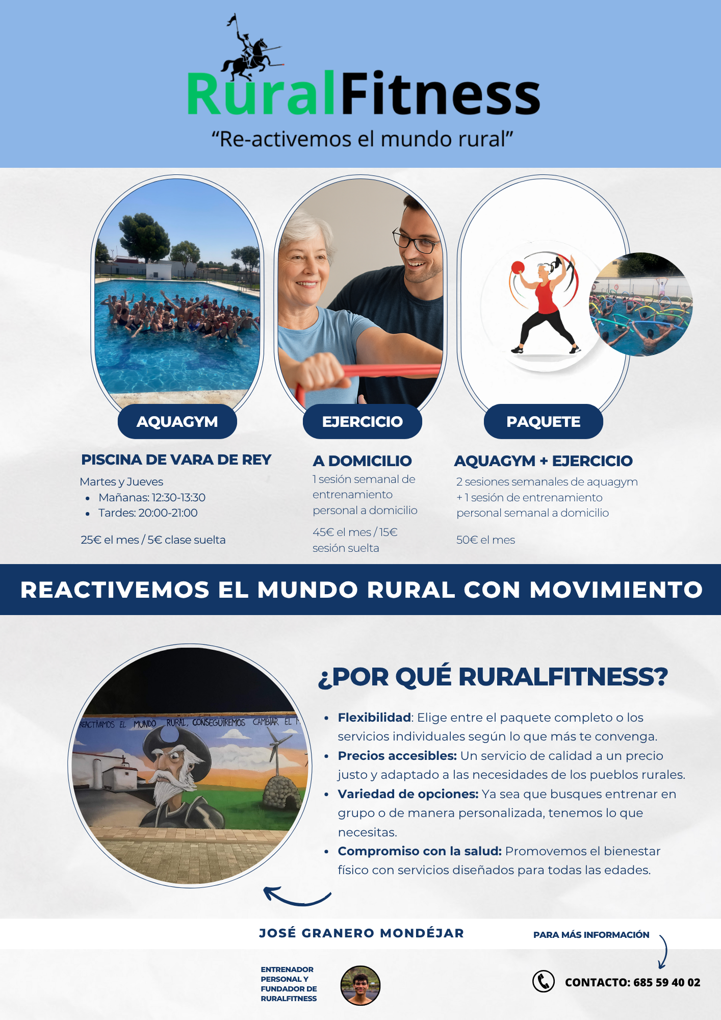 Nuestro vecino, José Granero Mondéjar ofrece clases de Aquagym en la piscina de Vara de Rey los martes y jueves. Podéis consultarle sobre el servicio de entrenamiento personal en el teléfono 685 59 40 02.