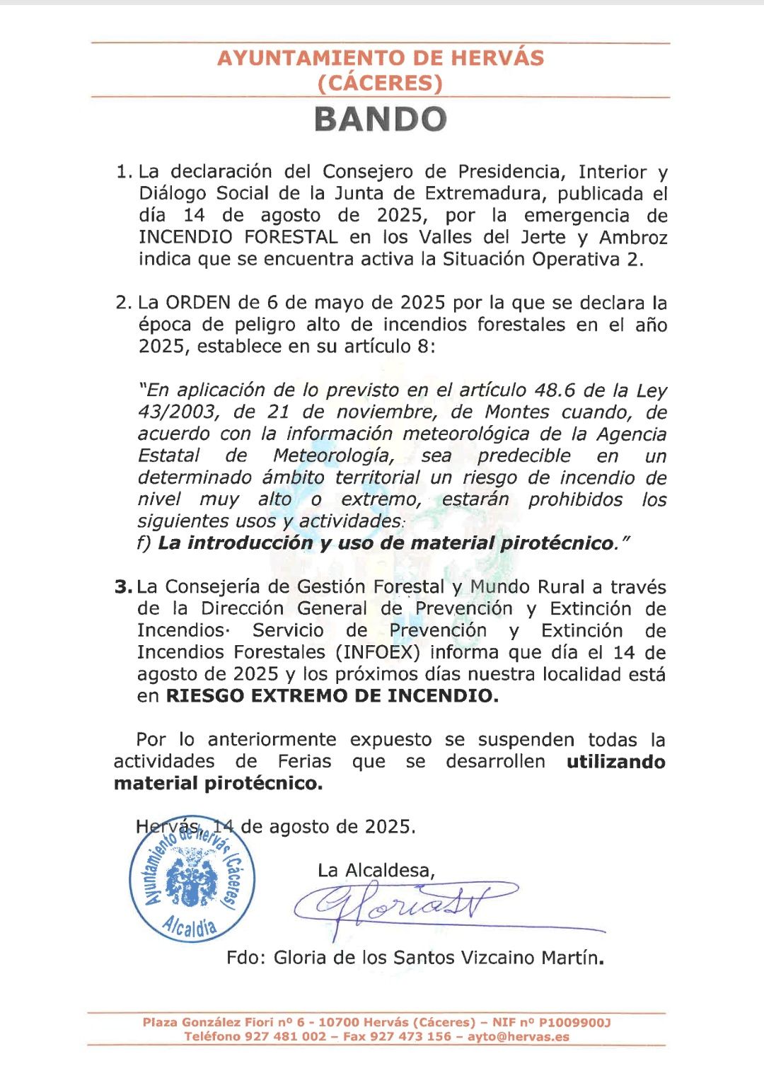 Adjunto archivo bando sobre riesgo extremo de incendio, y suspensión actividades en el que se desarrollen utilizando material pirotécnico.
