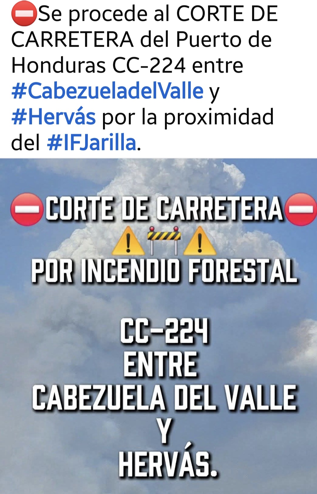 Puesto en contacto con el mando del CECOPI se nos comunica que Hervás, de momento no corre peligro.Se ha cortado la carretera del Puerto de Honduras por precaución Seguiremos informando