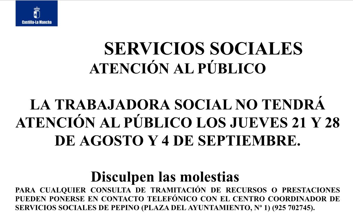 El trabajador/a social no tendrá atención al público los jueves 21 y 28 de Agosto y 4 de Septiembre.