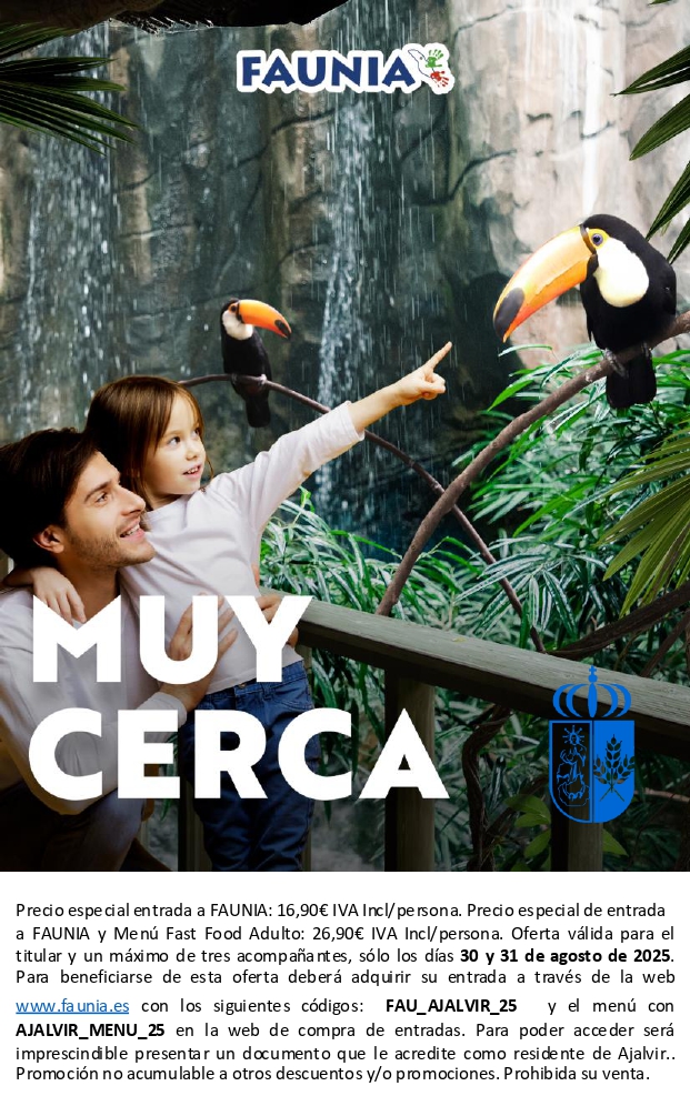 Los días 30 y 31 de Agosto todos los empadronados de Ajalvir, tendrán un precio especial de 16,90€/persona y Menú Fast Adulto de 26,90€/persona . Oferta valida para el titular y tres acompañantes . Para beneficiarse de la oferta deberá adquirir su entrada a través de la web : www.faunia.es con los códigos : FAU_AJALVIR_25 y el menú AJALVIR_MENU_25.