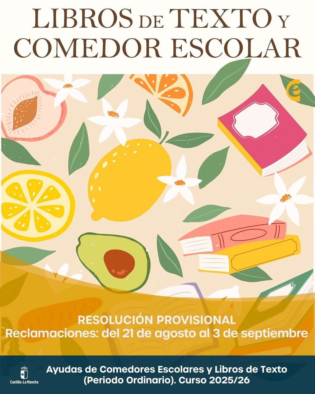 Publicada la Propuesta de Resolución Provisional de la Convocatoria de Ayudas para Comedores Escolares y Libros de Texto del curso 2025/2026 en Castilla-La Mancha.