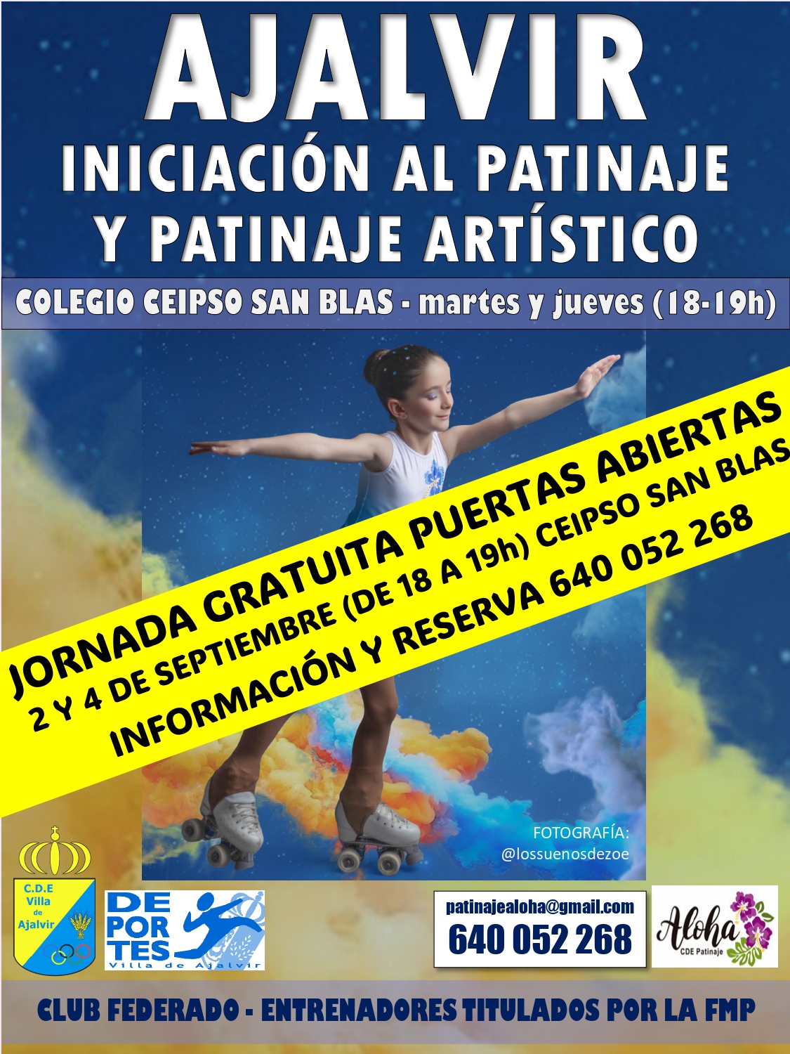 NUEVA ACTIVIDAD DEPORTIVA Los próximos días 2 y 4 de septiembre , tendremos jornadas de puertas abiertas de Iniciación al Patinaje y Patinaje Artístico en la pérgola del CEIPSO SAN BLAS . Información e inscripciones en el teléfono: 640 052 268