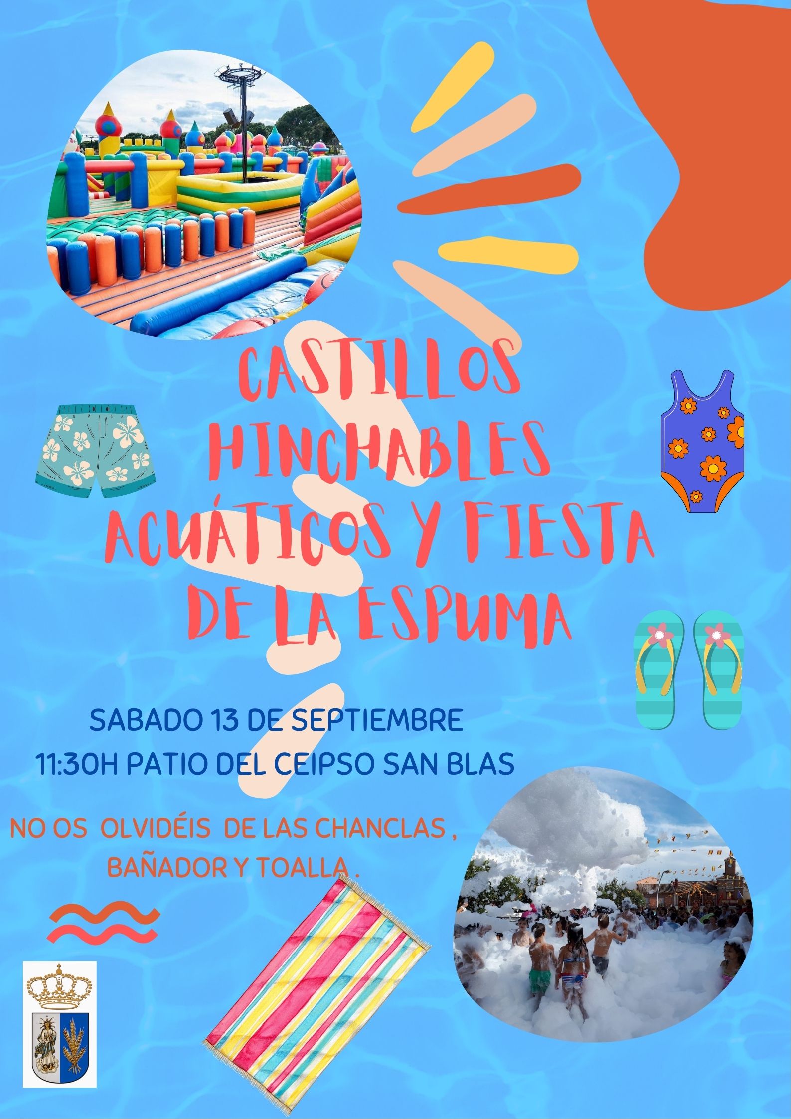 CASTILLOS HINCHABLES ACUÁTICOS Y FIESTA DE LA ESPUMA El próximo sábado 13 de septiembre a las 11:30h en el patio del CEIPSO San Blas , os esperamos no olvidéis vuestras chanclas y toalla.