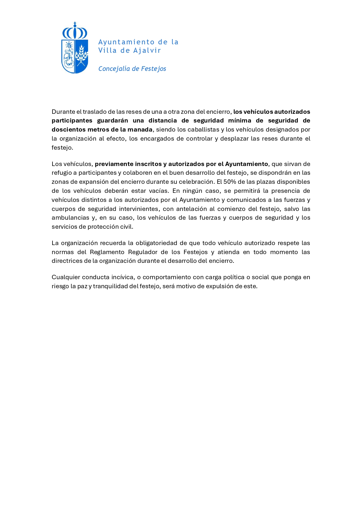Para el desarrollo del tradicional encierro por el campo y con el objetivo de garantizar la seguridad y el orden durante el festejo, la organización ha establecido que queda terminantemente prohibida la participación de caballistas y vehículos a motor no autorizados en la zona de suelta y expansión del mismo.