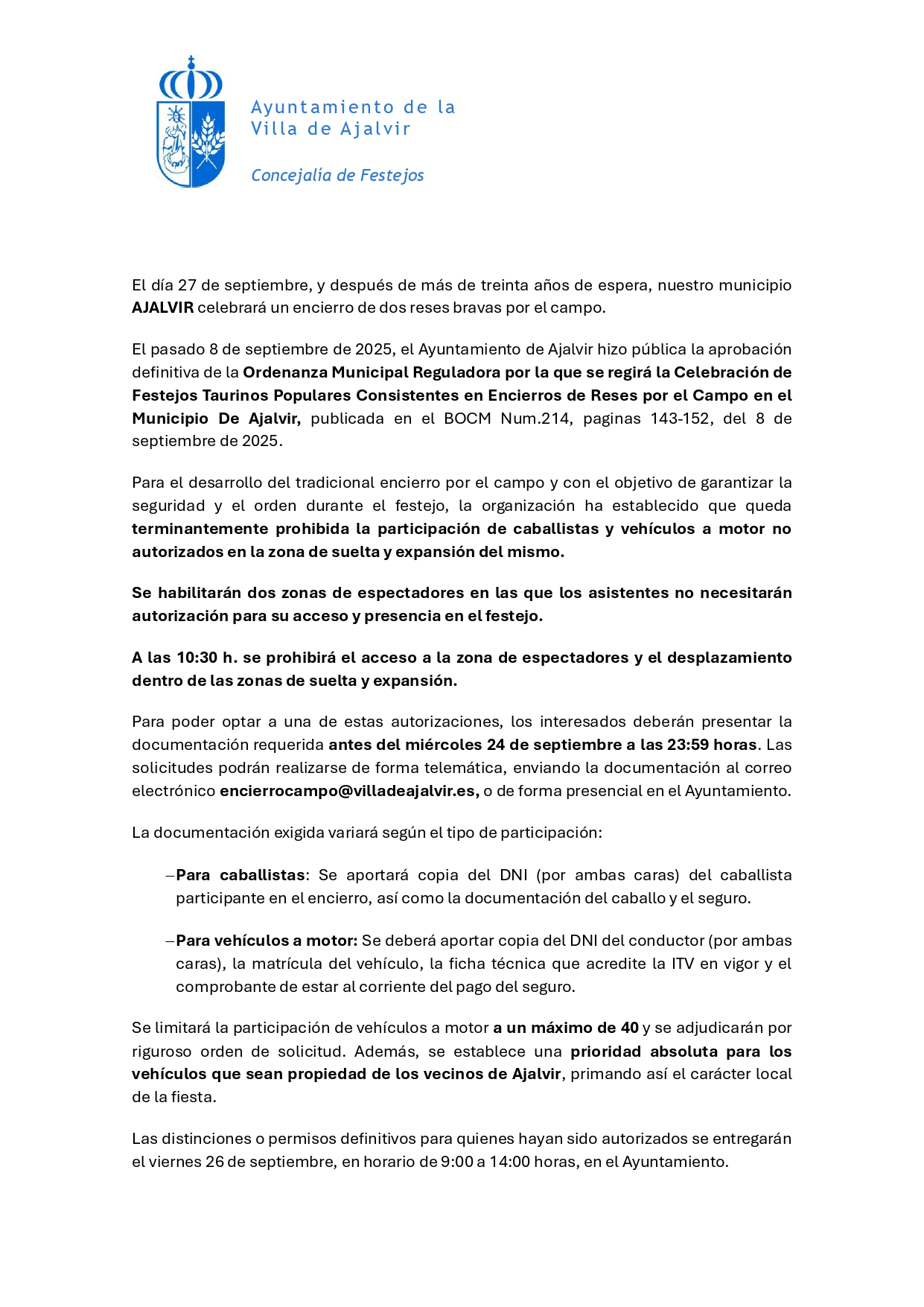 El pasado 8 de septiembre de 2025, el Ayuntamiento de Ajalvir hizo pública la aprobación definitiva de la Ordenanza Municipal Reguladora por la que se regirá la Celebración de Festejos Taurinos Populares Consistentes en Encierros de Reses por el Campo en el Municipio De Ajalvir, publicada en el BOCM Num.214, paginas 143-152, del 8 de septiembre de 2025.