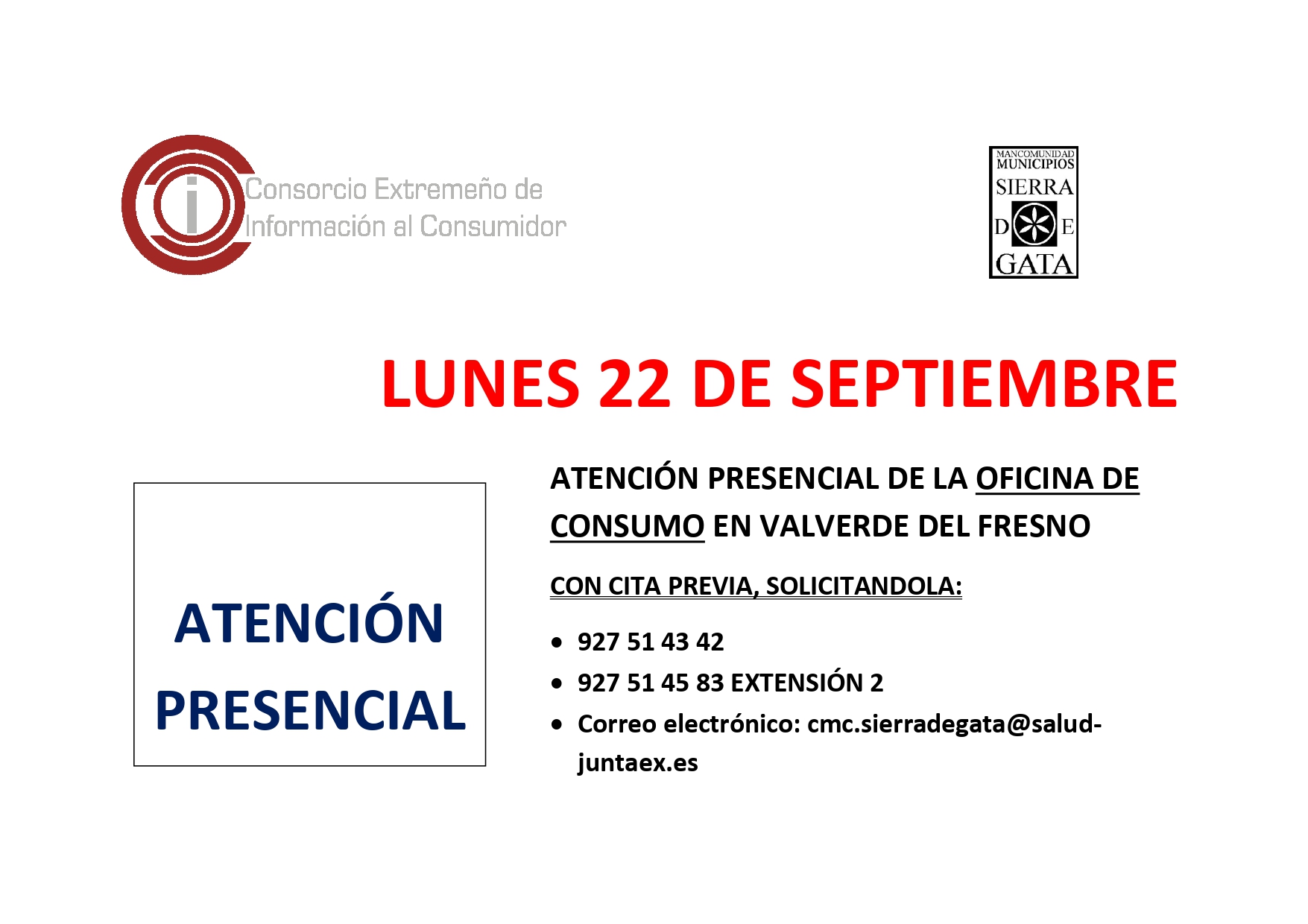 El próximo lunes, 22 de septiembre, habrá atención presencial de la Oficina de Consumo en este ayuntamiento.