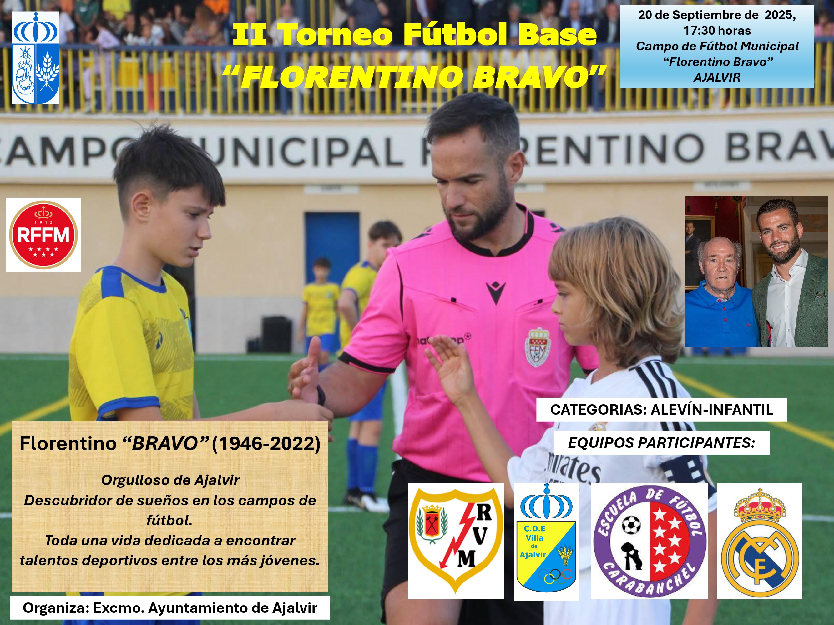 El próximo día 20 de septiembre a las 17:30h , tendrá lugar el II Torneo de Futbol base en honor a nuestro vecino Florentino Bravo .