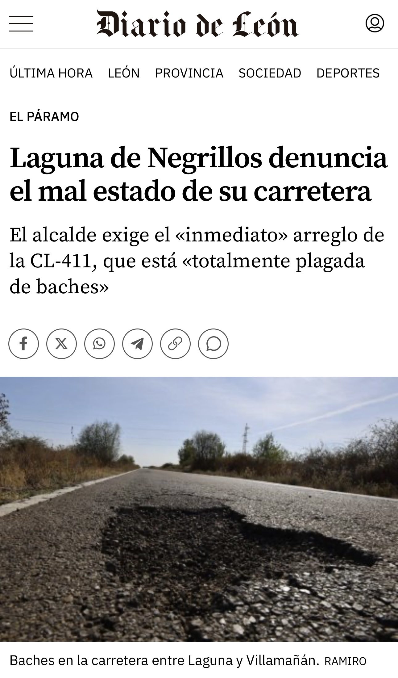 El alcalde de Laguna de Negrillos, Isidro García del Ganso, ha denunciado el «lamentable» estado en el que se encuentra una de las principales vías de comunicación de su municipio. Se trata de la CL-411, que une Laguna de Negrillos con Villamañán, diez kilómetros que se encuentran «totalmente plagados de baches» lo que supone «un peligro para la seguridad de vial de todos los usuarios», añade.
