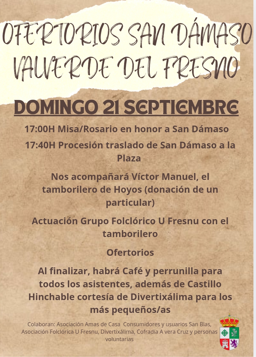 - VICTOR MANUEL EL TAMBORILERO DE HOYOS PARA DAR EL TOQUE ANCESTRAL CON SU MÚSICA A NUESTROS OFERTORIOS Y ACTUARÁ EL GRUPO FOLCLÓRICO LOCAL U FRESNU A LA LLEGADA DE SAN DÁMASO A LA PLAZA.