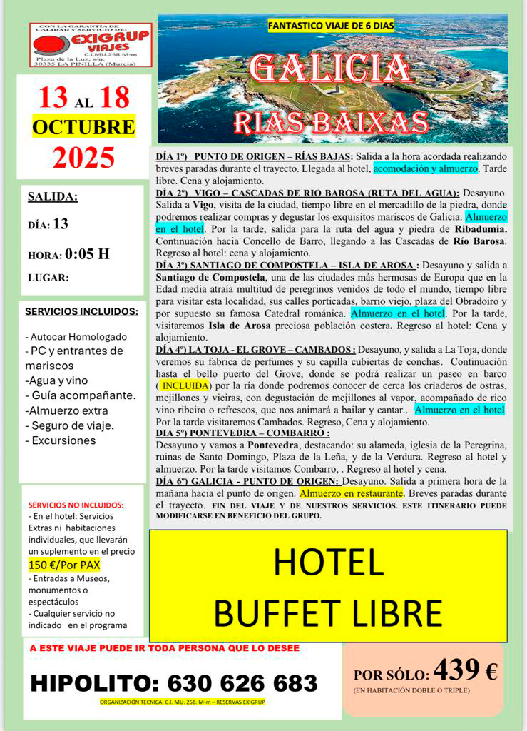 Toda la información del viaje a Galicia del 13 al 18 de octubre en el cartel adjunto:
