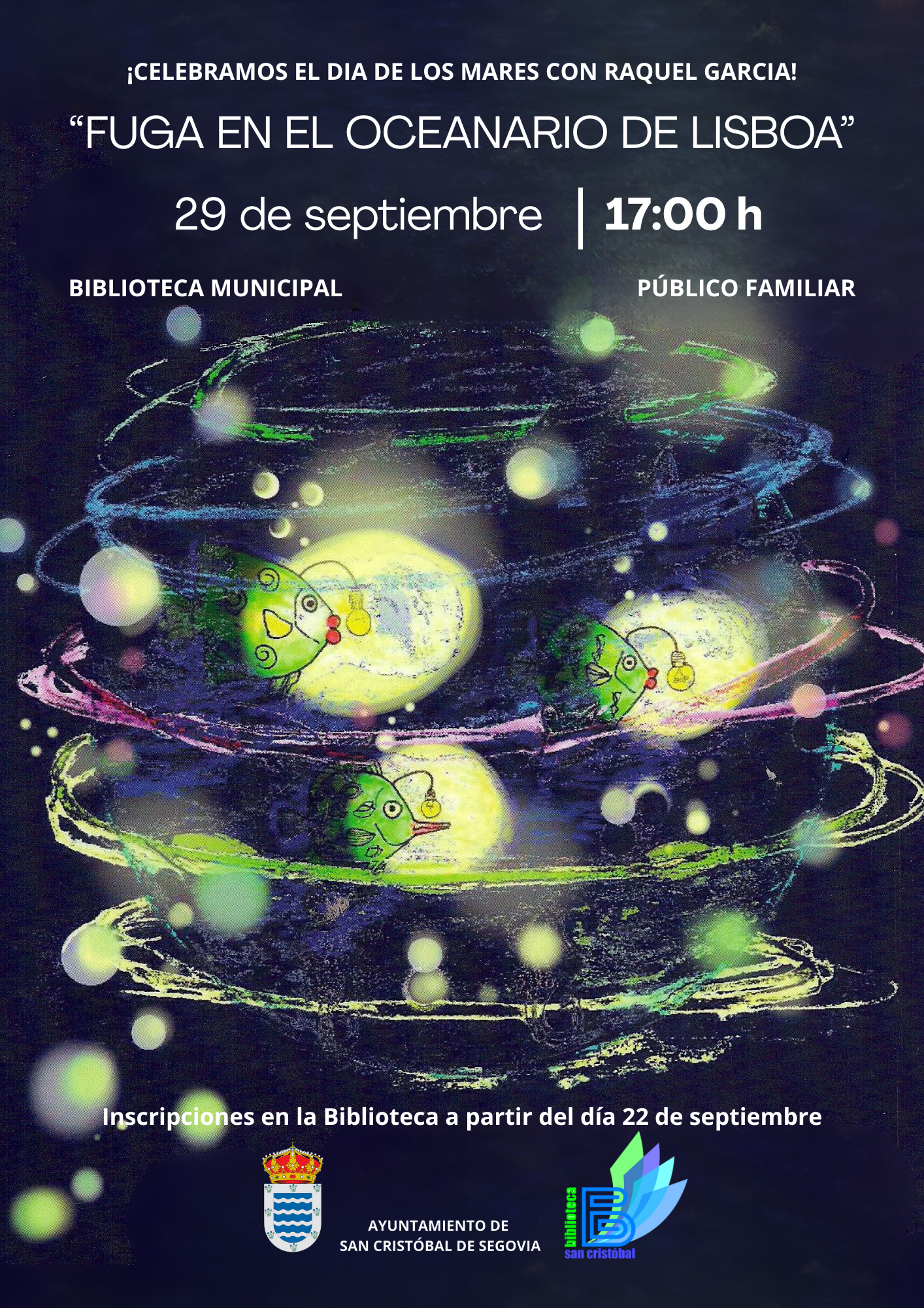 Este lunes 29 de septiembre a las 17 h, te invitamos a celebrar el Día de los Mares con una propuesta artística para todos los públicos: la presentación de la obra “FUGA EN EL OCEANARIO DE LISBOA” de la artista Raquel García, en la Biblioteca.