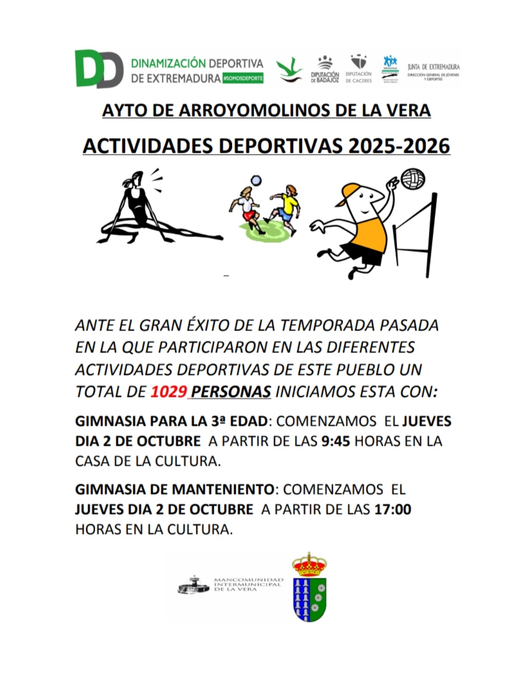 Se adjunta cartel que nos remite el dinamizador deportivo con el día y la hora del comienzo de la gimnasia para mayores y de mantenimiento.