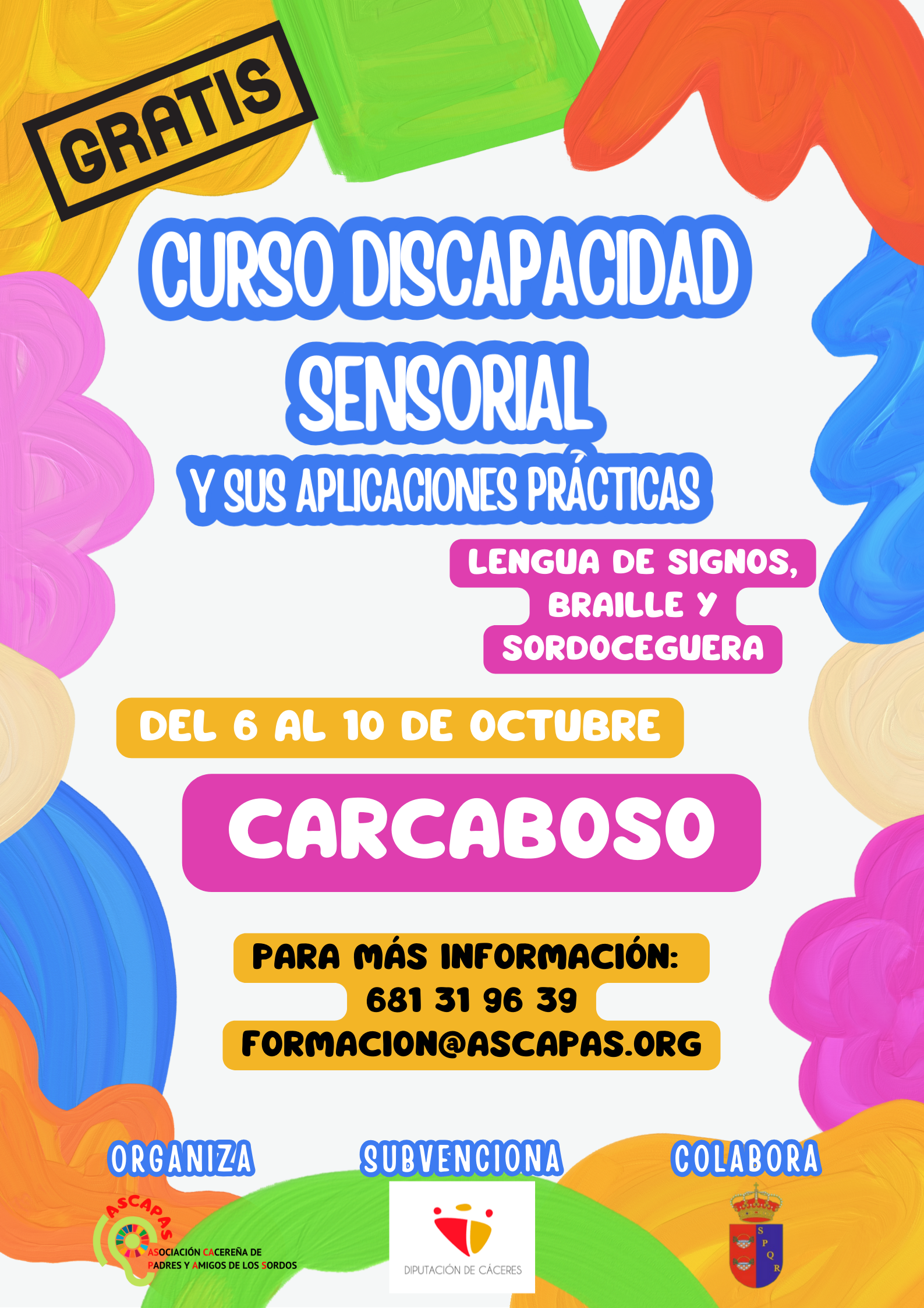 Os informamos que próximamente se va a realizar en Carcaboso un curso de Discapacidad Sensorial y sus aplicaciones prácticas: Lengua de signos, Braille y Sordoceguera, dirigidas a todas las personas mayores de 18 años, residentes en la Comarca del Valle del Alagón.