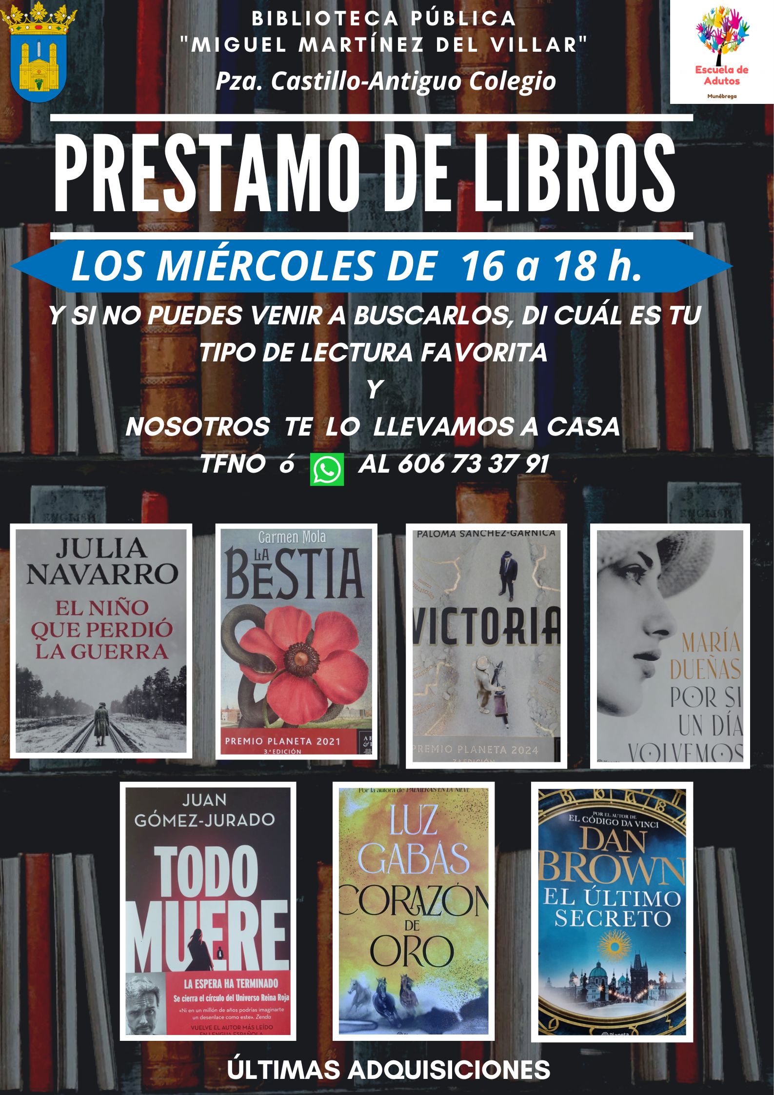 Todos los miércoles entre las 4 y las 6 de la tarde, puedes acercarte a la Biblioteca Municipal "MIGUEL MARTÍNEZ DEL VILLAR" a coger prestado algún libro.