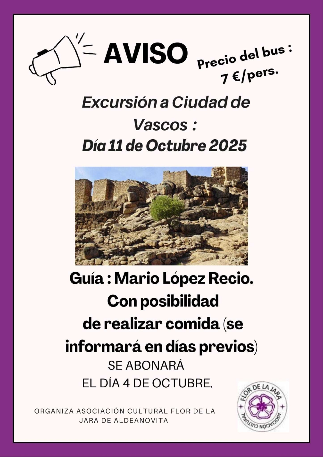 La Asociación Cultural "Flor de la Jara" organiza una excursión a CIUDAD DE VASCOS para el próximo 11 de octubre de 2025; serán 7€ por persona que se abonarán el 4 de octubre a Maribel o Petra.¡¡os esperamos!!