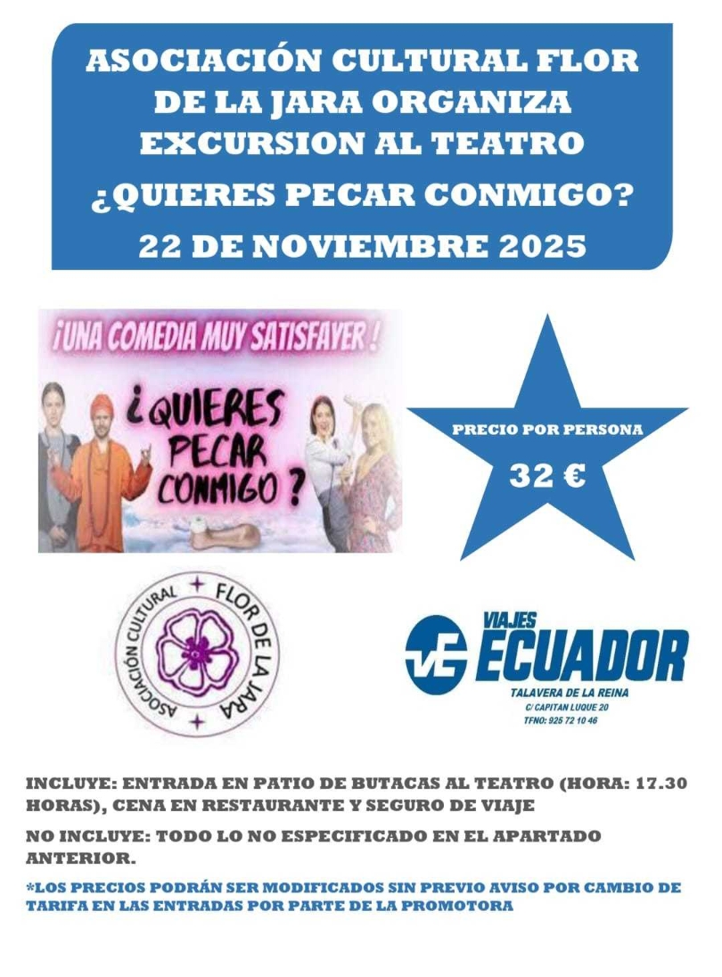 La Asociación Cultural FLOR DE LA JARA organiza para el 22 de noviembre de 2025 una salida al TEATRO para ver la comedia "¿Quieres pecar conmigo?".