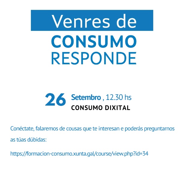 Este venres 26 de SETEMBRO ás 12.30 celebrase a través da aula virtual de consumo unha actividade na que darase uns pequenos consellos para aprender sobre CONSUMO DIXITAL. Faremos unha pequena exposición sobre os dereitos que temos e responderemos a todas as dúbidas que teñades en materia de consumo.