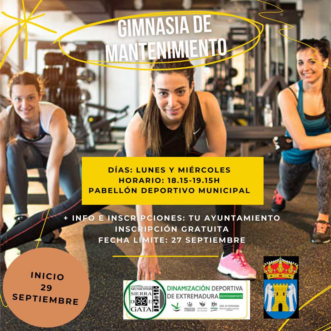 SE ADJUNTA CARTEL INFORMATIVO DEL COMIENZO DE GIMNASIA DE MANTENIMIENTO EN EL PABELLÓN MUNICIPAL LOS LUNES Y MIÉRCOLES DE 18:15H A 19:15H. COMIENZA EL 29 DE SEPTIEMBRE Y PUEDEN PASARSE POR EL AYUNTAMIENTO PARA INSCRIBIRSE.