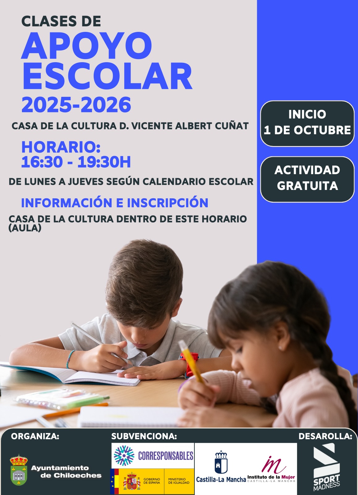 El Ayuntamiento de Chiloeches pone en marcha, a través del Plan Corresponsables de la Junta de Comunidades de Castilla-La Mancha, las clases de apoyo escolar GRATUITAS para ayudar a los estudiantes del municipio.