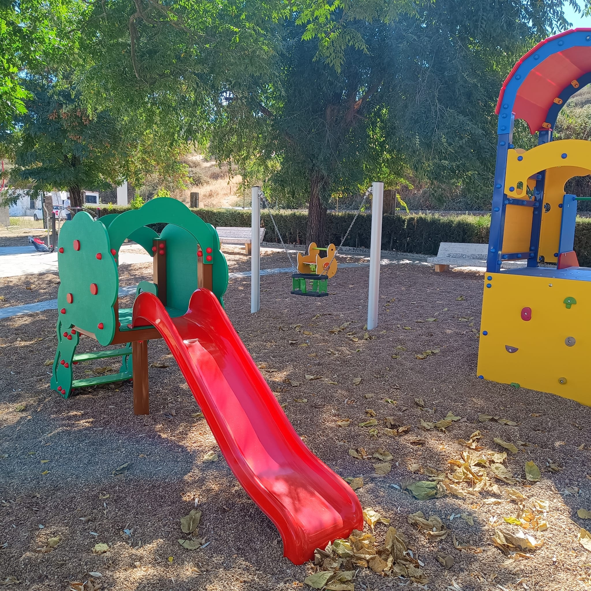 Sustitución de columpios e instalación completa de una zona de juegos infantiles renovada.