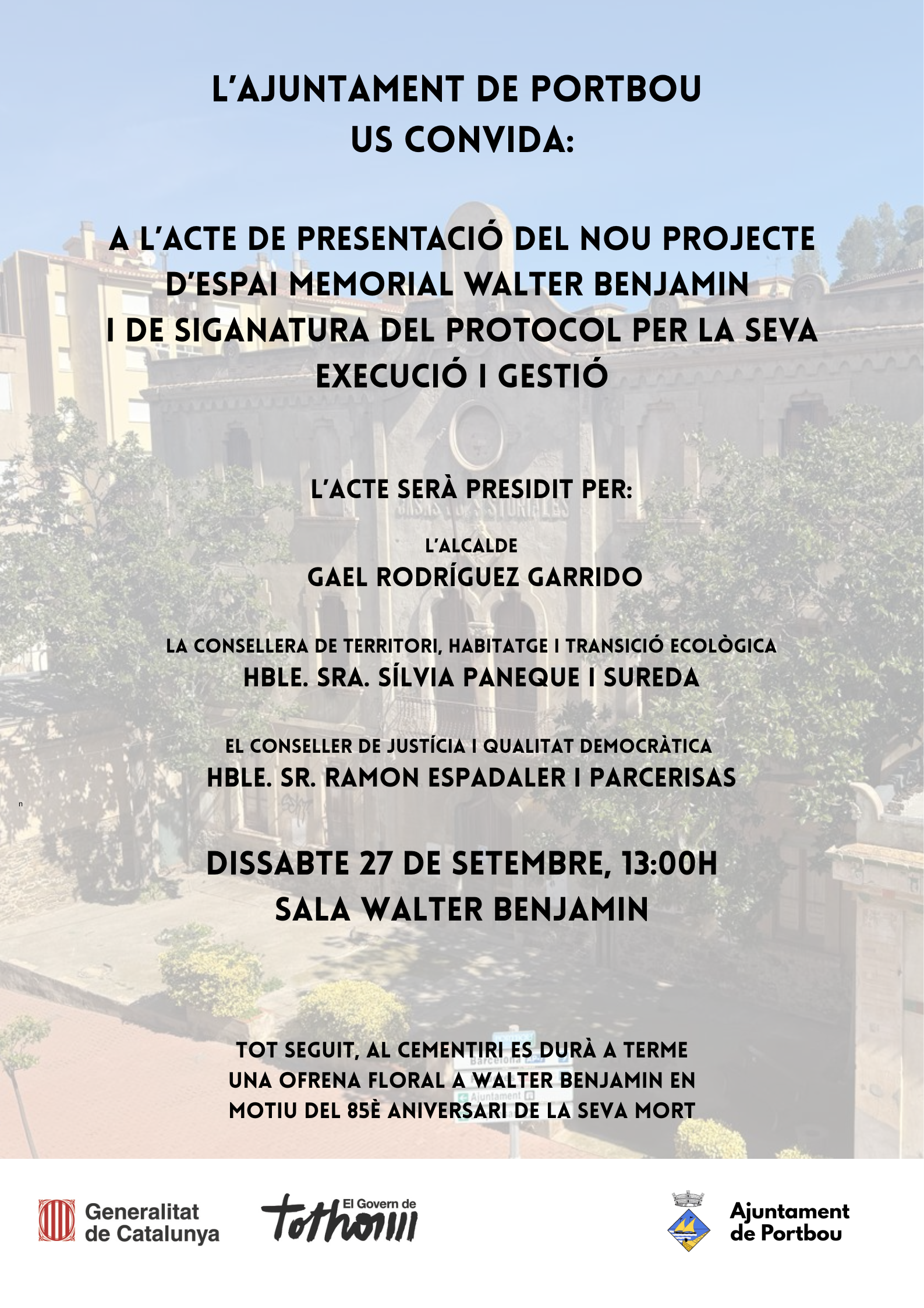 Demà, dissabte 27 de setembre a les 13H, en el marc del col·loqui internacional Walter Benjamin, es presentarà a la sala Walter Benjamin el projecte definitiu de rehabilitació de les antigues escoles i antic ajuntament per esdevenir l’Espai Memorial Walter Benjamin.