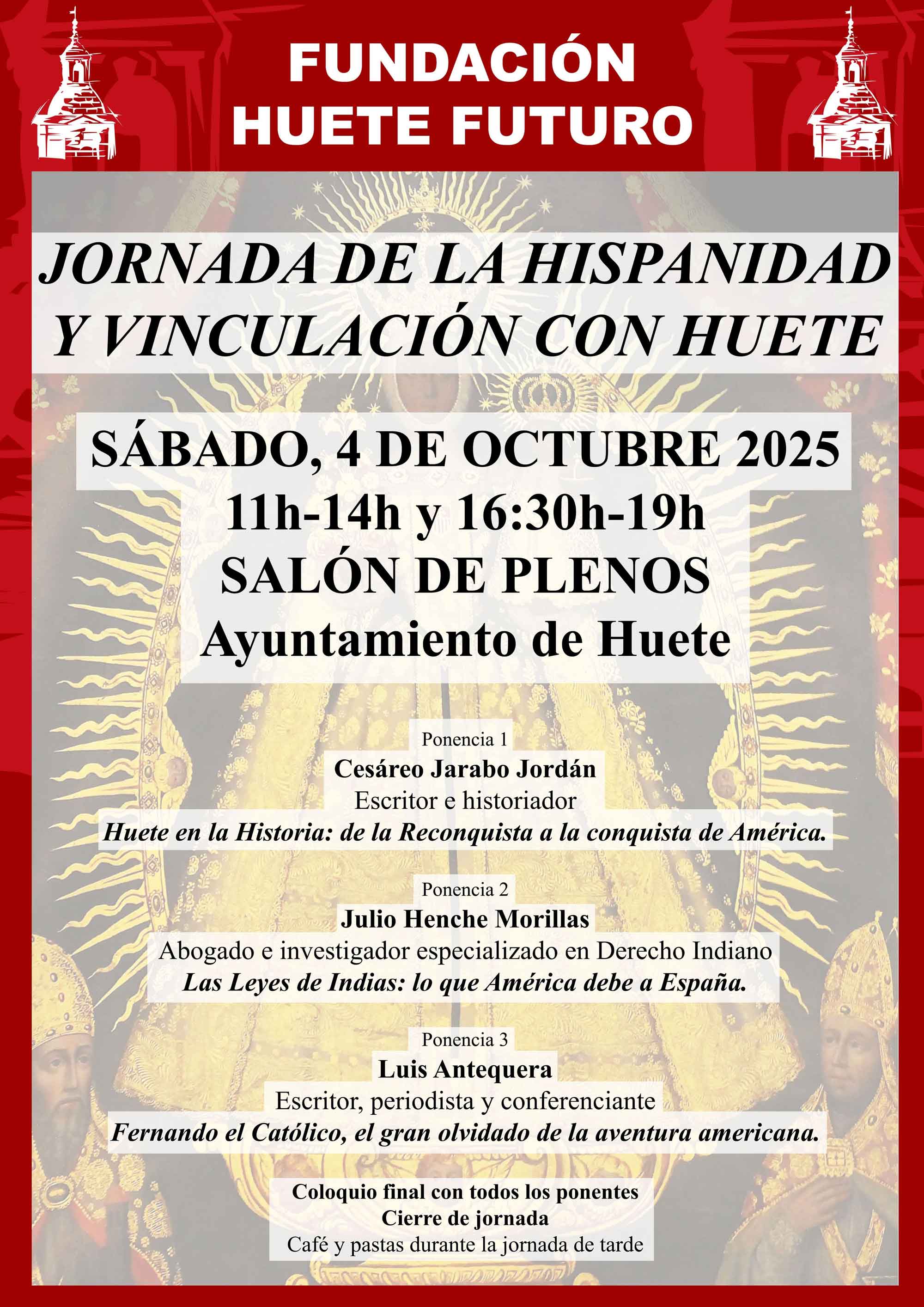 El Ayuntamiento de Huete informa de la celebración de la Jornada de la Hispanidad y su vinculación con Huete, organizada por la Fundación Huete Futuro, el sábado 4 de octubre en el Salón de Plenos desde las 11:00h.