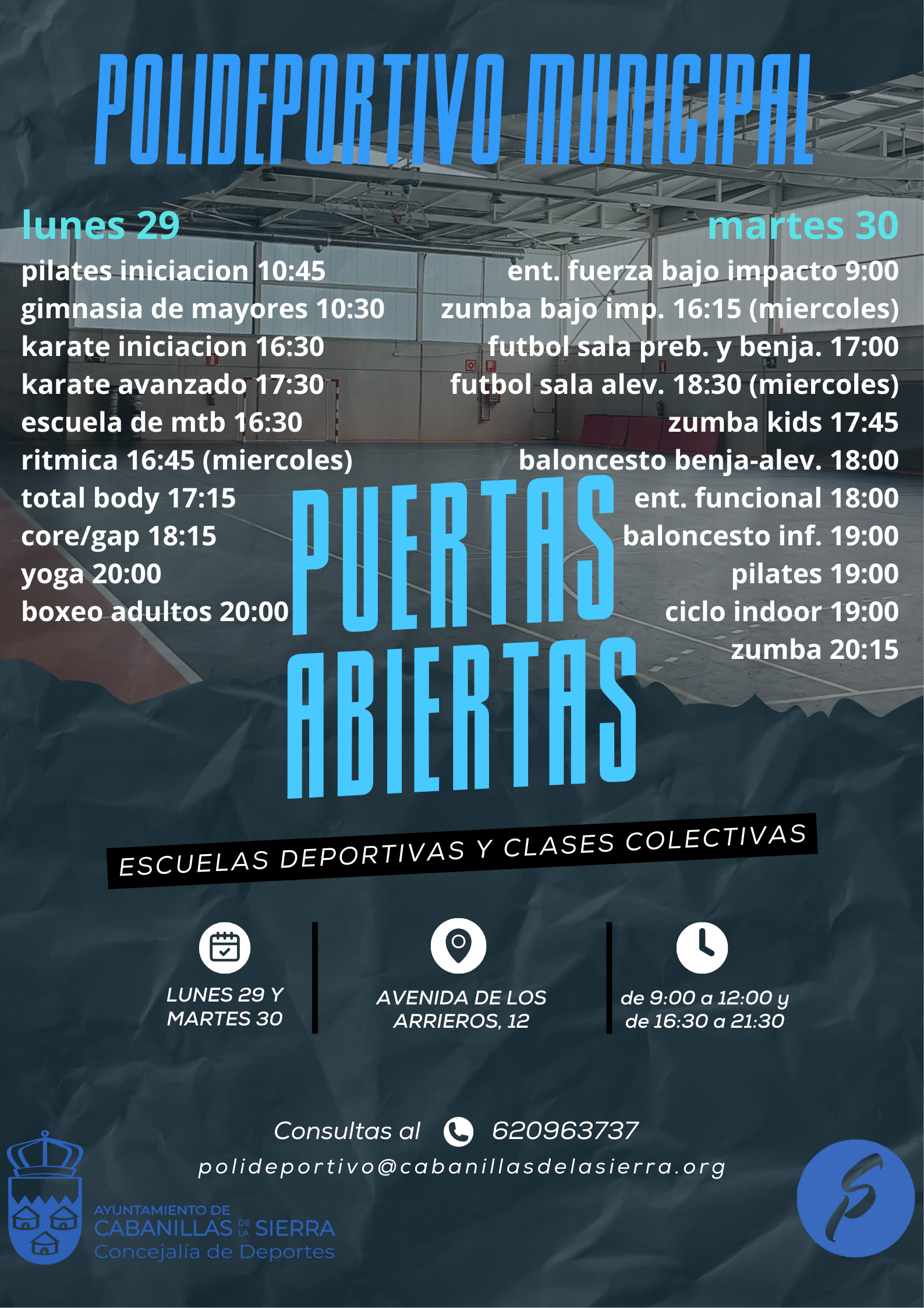 Para terminar el mes, os invitamos a los que aun no habéis pasado por el polideportivo a probar toda nuestra oferta deportiva, tanto en clases colectivas de adultos, como en nuestras escuelas deportivas para los mas pequeños!!!