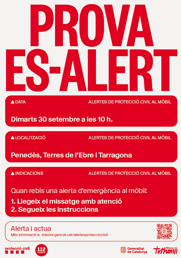 📣 L'Ajuntament de l'Albiol informa que el pròxim dimarts, 30 de setembre, a les 10 h, els mòbils de totes les persones que es trobin a l’Albiol rebran un missatge d’alerta d’emergència. Es tracta només d’una prova del sistema ES-Alert de Protecció Civil, que permet avisar la població en cas de risc greu i que afectarà la població del Camp de Tarragona, les Terres de l'Ebre i el Penedès.