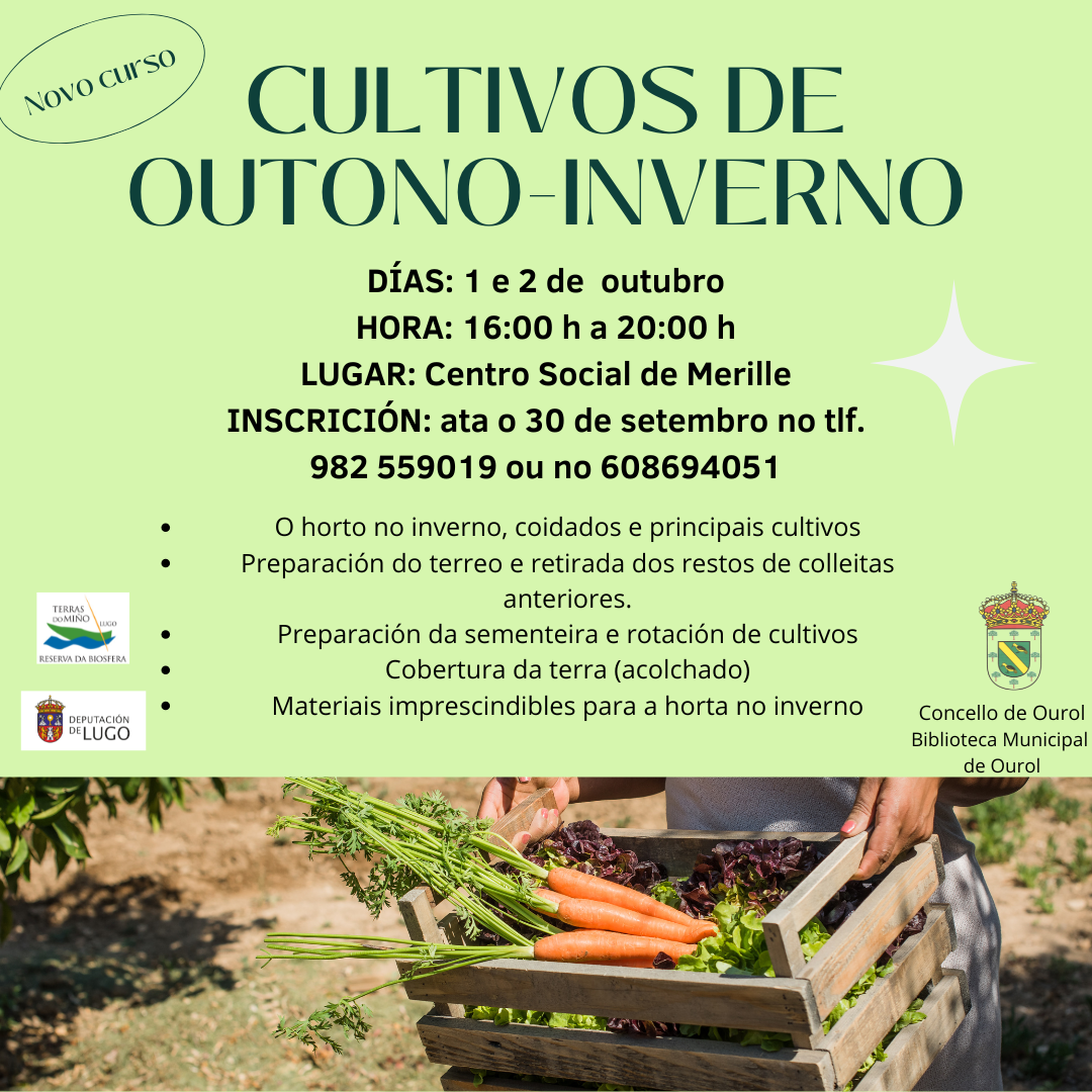 O Concello de Ourol vai organizar un “CURSO SOBRE OS CULTIVOS DE INVERNO” co obxectivo principal de aprender de forma práctica como preparar o horto doméstico nos meses de outono e inverno. Aprenderemos os principais coidados e cultivos; a rotación de cultivos, os tempos da colleita das hortalizas de inverno, cobertura da terra, etc…