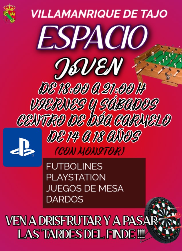 Espacio joven, abierto desde este 3 de Octubre. Todos los viernes y sábados de 18:00 a 21:00 horas. Para jóvenes de 14 a 18 años.