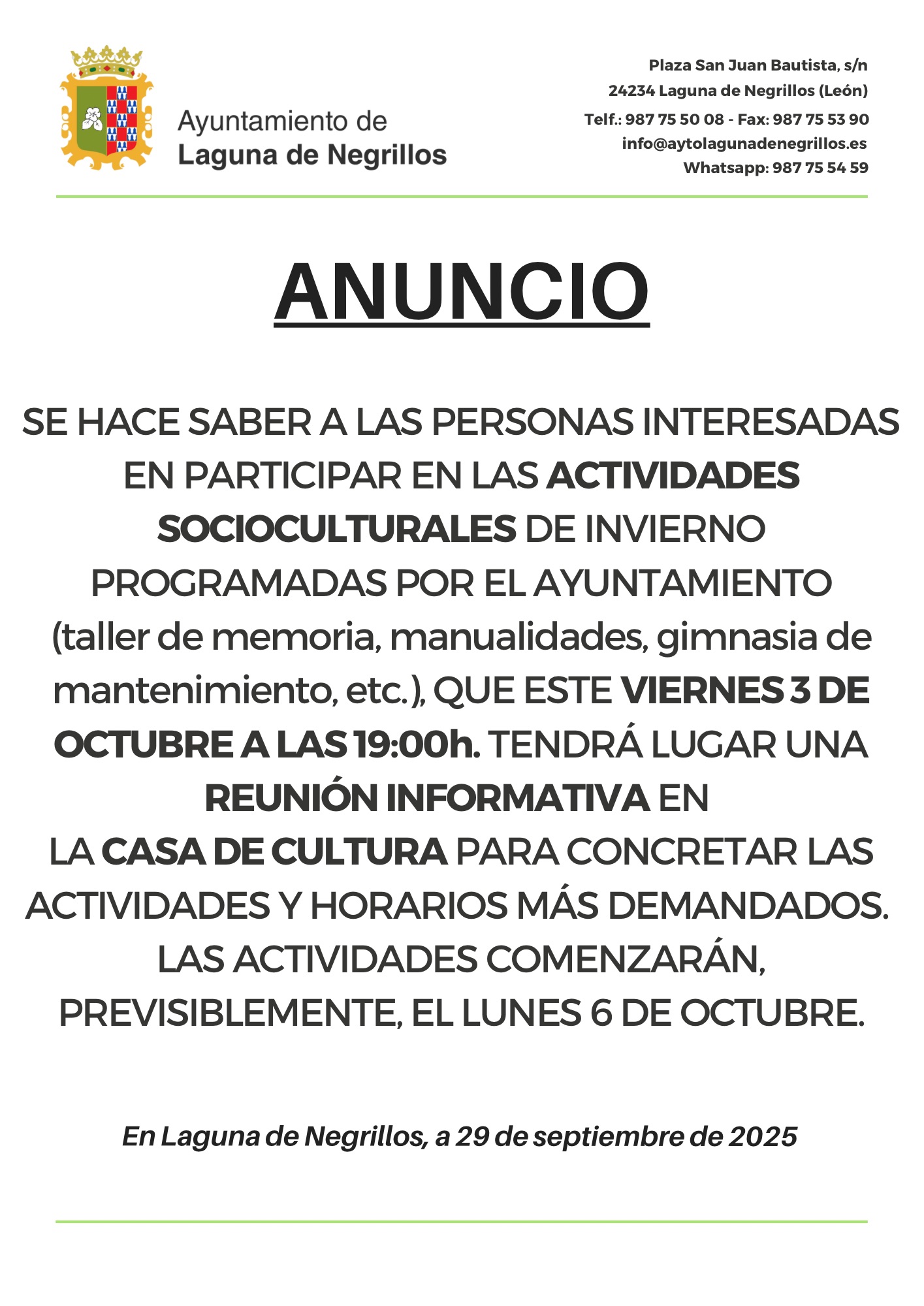 Reunión informativa este viernes 3 de octubre a las 19:00h. en la Casa de Cultura para las personas interesadas en participar en las Actividades Socioculturales durante los meses de invierno.