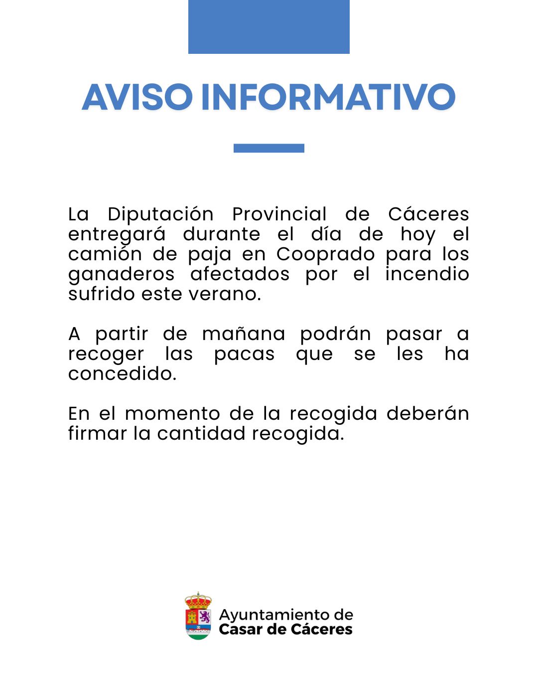 La Diputación Provincial de Cáceres entregará durante el día de hoy el camión de paja en Cooprado para los ganaderos afectados por el incendio sufrido este verano.